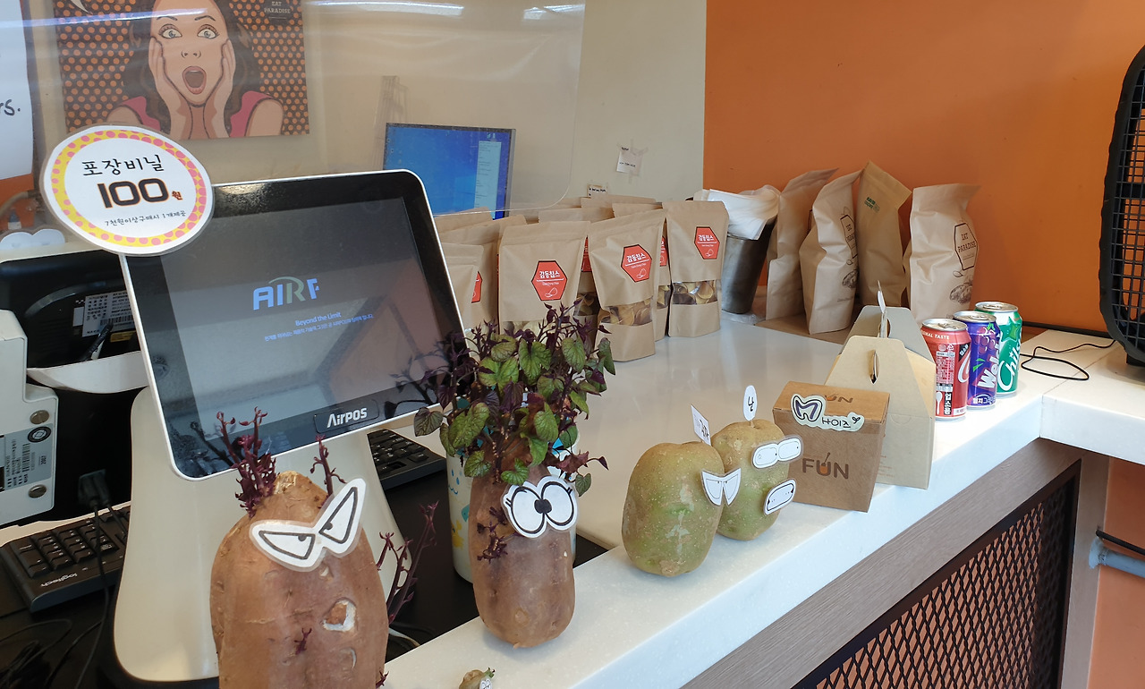 주문하고 계산하면, 바로 옆에 줄지어 늘어선 감자칩과 고구마칩을 봉투에 넣어 담아 준다.