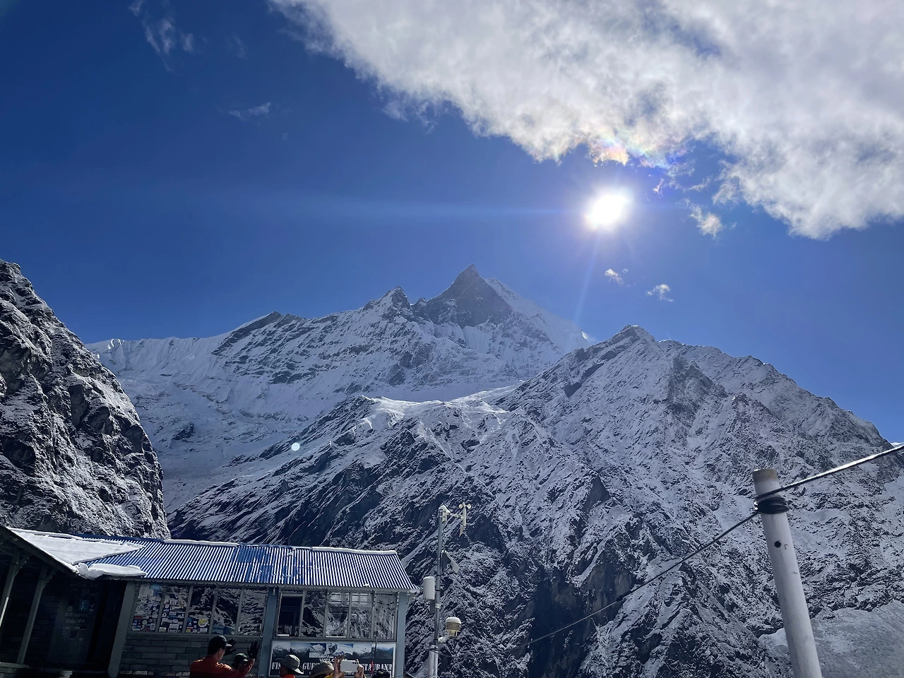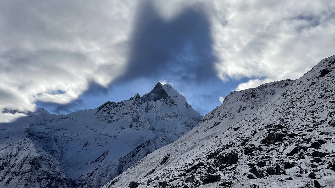 가려진 구름이 다 걷혀 본모습 그대로의 모습을 드러내자 경이로운 풍경이 펼쳐졌다. 설산을 중심으로 고원이 펼쳐져 있었다. 우리가 있는 곳이 높아 안나푸르나 남봉도 너무도 가깝게 보였다. 마차푸차레의 봉우리에는 아직 떠나지 못한 구름이 걸려 있었고 봉우리는 햇빛을 받아 빛나고 있었다.