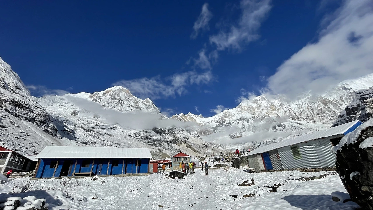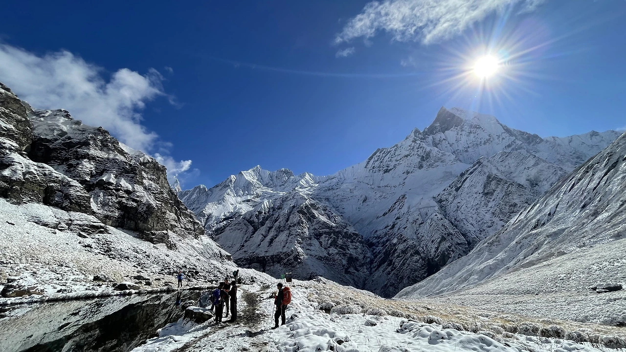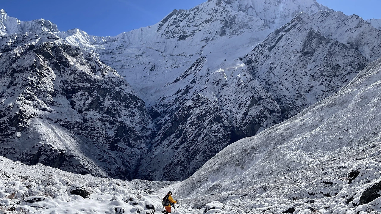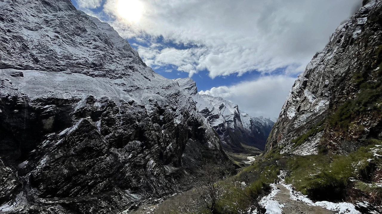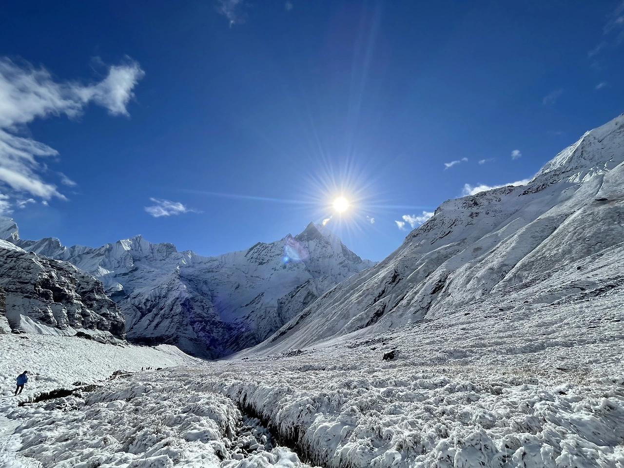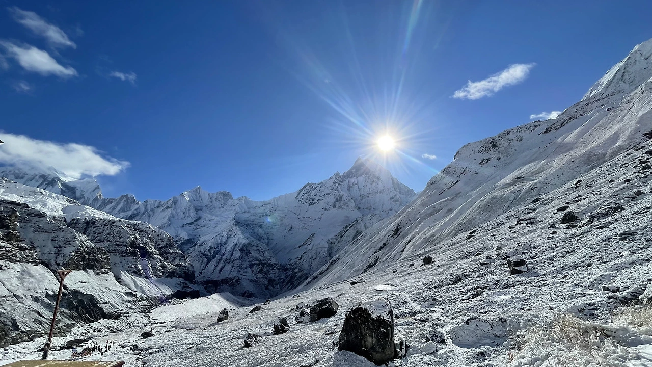내가 서 있던 A.B.C를 중심으로 빙 둘러 웅장한 산들이 둘러싸고 있었다. 사방은 눈으로 하얗고 높게 내려다보는 산에 푹 싸여 있었다.