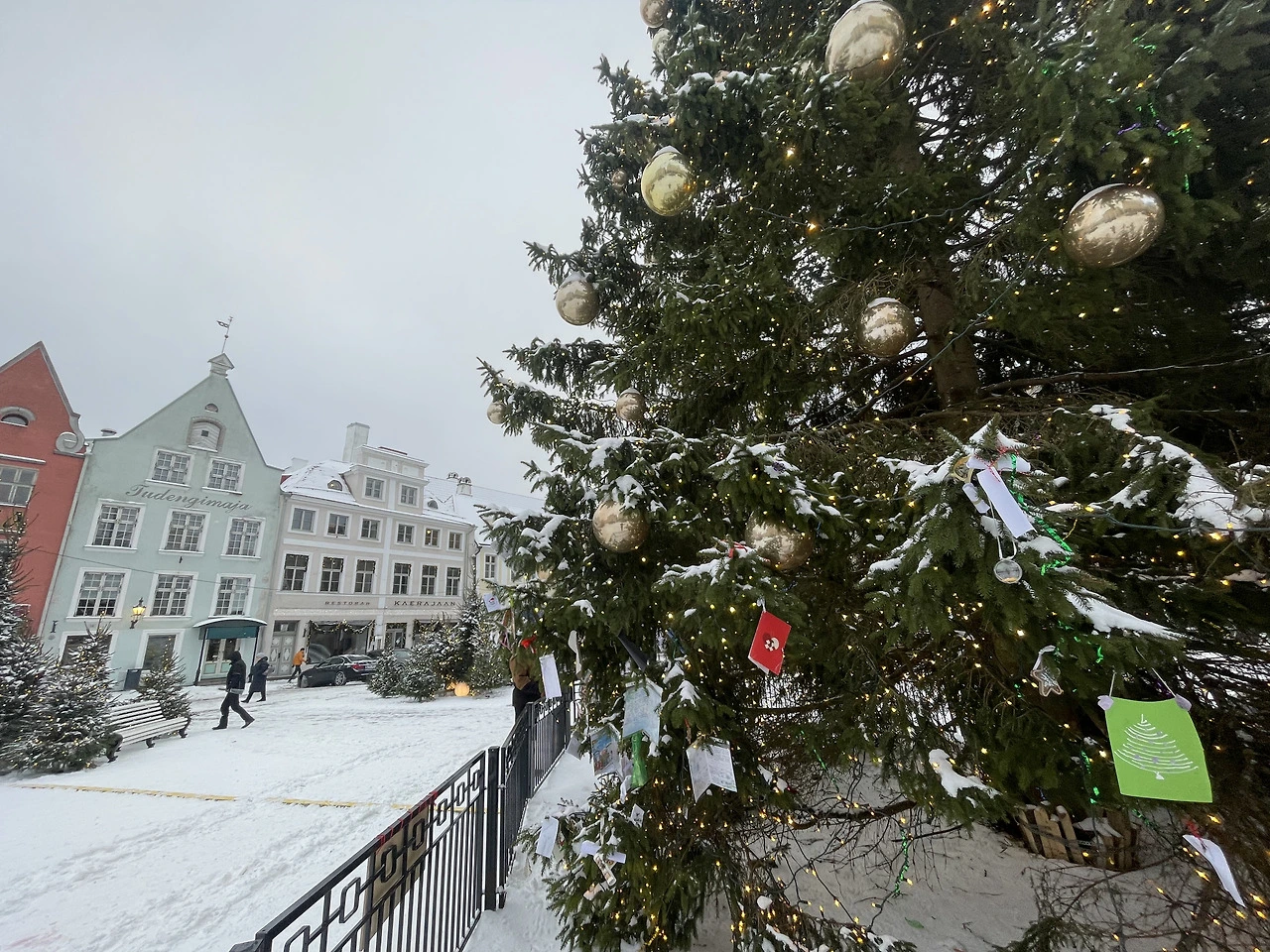 트리 장식이 내 머리만 (실제로는 머리보단 작았지만) 했다. 트리 뒤로 보이는 옛 모습의 건축물들.