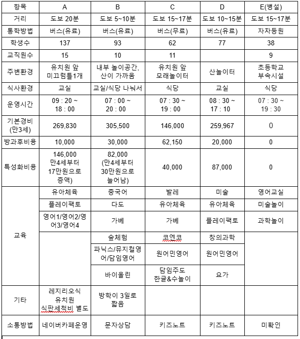 총 5군데의 유치원을 비교하게 됩니다.