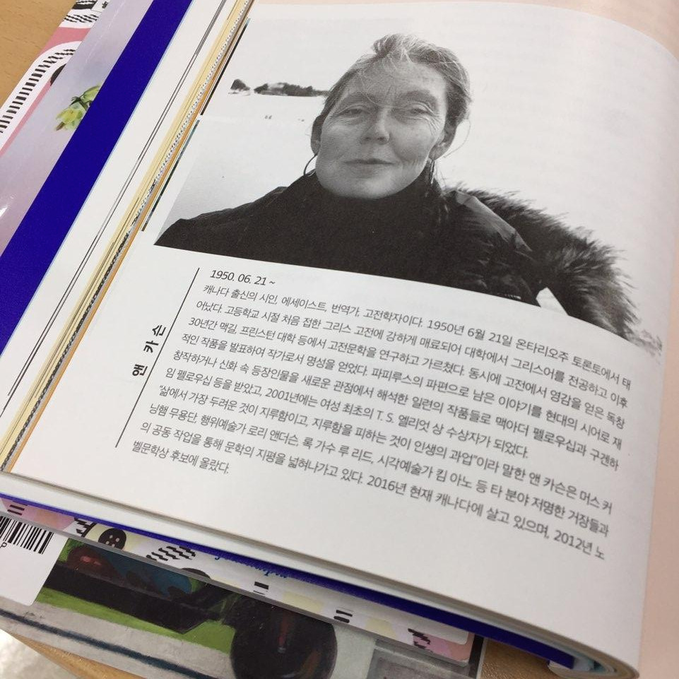 그리고 오늘 만난 앤 카슨, 이전의 나라면 그저 넘길 페이지였지만 한동안 들여다보고 좋아서 사진까지 찍었다. 오늘 앤 카슨의 책을 읽을 예정이다!