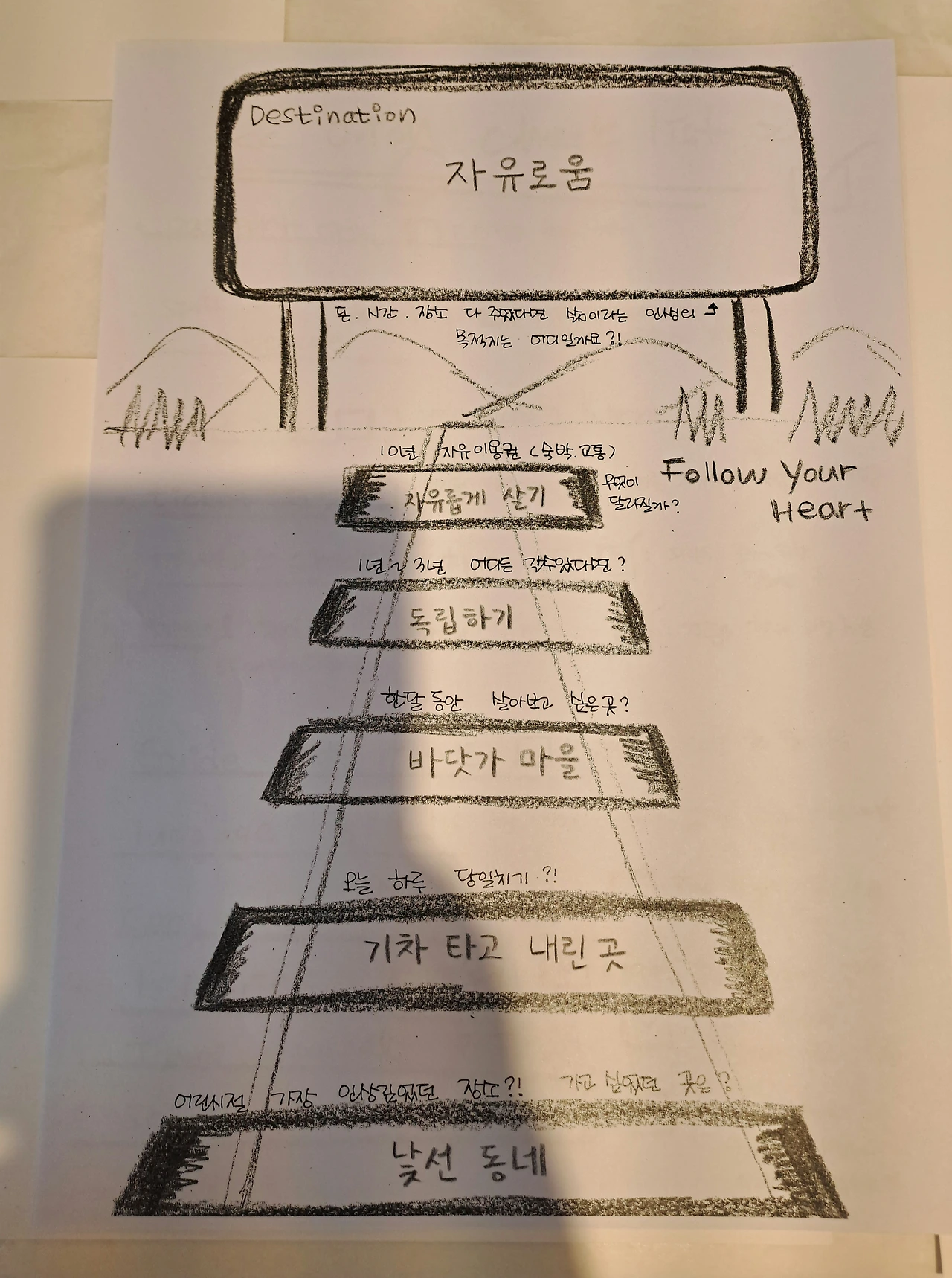 한참을 그린 후 우리는 마지막 워크지를 받았다. 가능하다면 과거로 돌아갈지 아니면 미래로 갈지, 간다면 무엇을 할지를 쓰고 그리는 거였다.
