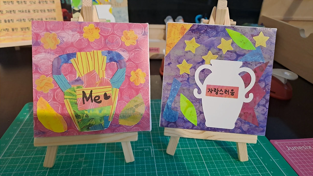 북토크를 듣고 친구와 함께 전시회에 갔다. 전시회는 한 카페 안의 갤러리에서 있었는데, 한켠에는 콜라쥬 체험을 할 수 있는 공간이 있었다. 우리는 콜라쥬 작업을 하면서 이야기를 나눴다.