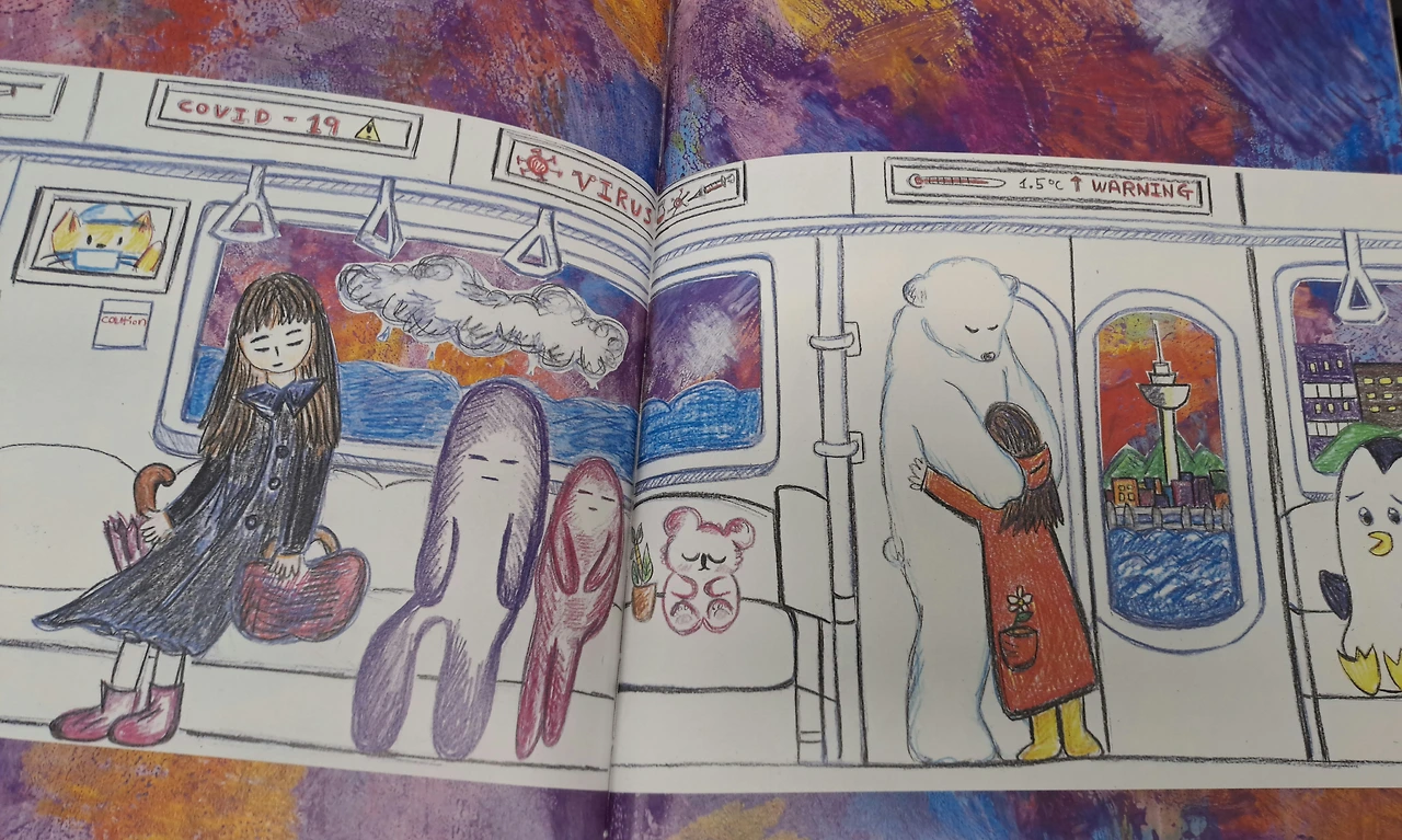 가장 인상적이었던건 이 페이지였다. 전철인데 곰도 타고 있고 펭귄도 타고 있다. 어떤 생물인지 모르는 것들도 의자에 앉아있다. 이 지하철이 지구의 모습을 보여준다고 느꼈다. 모두가 함께 하고 있는 지구.