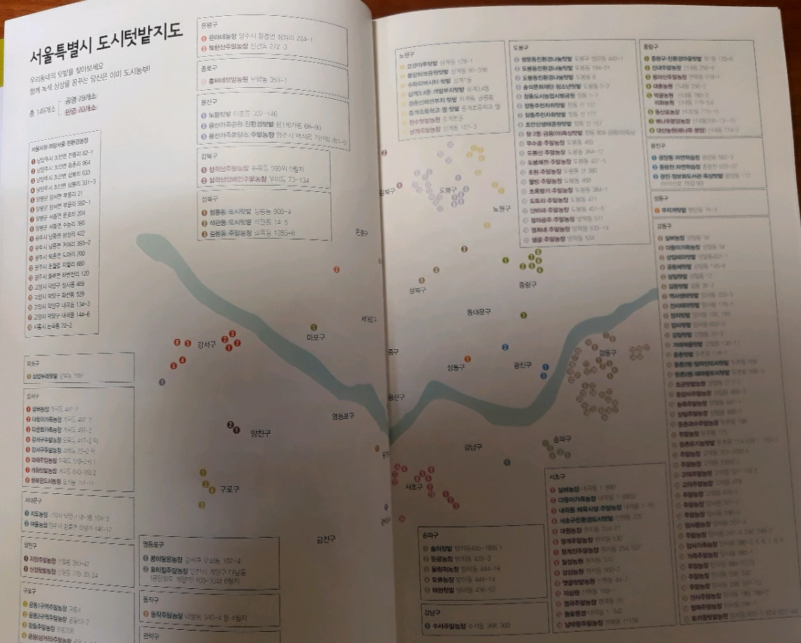 이런 교재를 주는데, 교재에는 작물별 재배법, 날짜별 해야할 일들 등이 잘 설명되어있다. 교재 앞쪽에는 '서울특별시 도시텃밭지도'가 있는데, 서울 시내에 공영 79개소, 민영 70개소, 총합 149개소의 도시텃밭이 있다고 한다. 규모가 어떻게 되는지는 모르지만 생각보다 굉장히 많은 숫자였다.