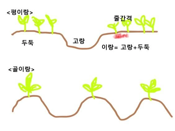 고랑과 두둑을 합한 것을 이랑이라고 한다. 위의 빨간 부분의 식물 사이의 간격을 '줄간격'이라고 하고, 그 너머의 옆쪽 식물과의 간격을 '포기 간격'이라고 한다고 한다. 상추, 쑥갓, 아욱 등 잎채소는 평이랑을, 고추, 토마토, 가지, 감자, 고구마는 골이랑을 만드는게 편리하다.