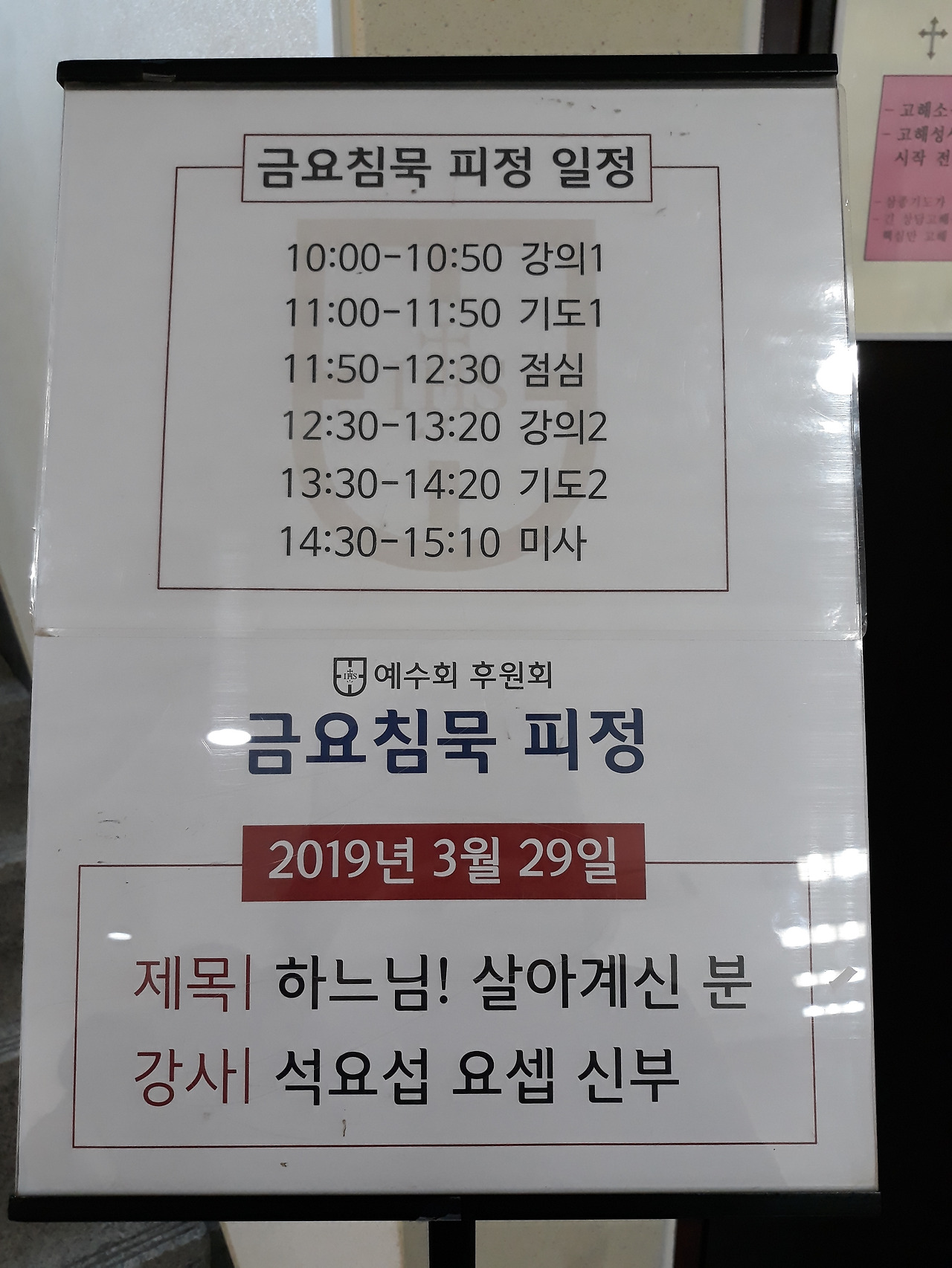 매주 금요일에 서강대 옆에 있는 예수회 센터에서 열리는 금요침묵 피정이에요. 회비는 없고 따로 신청해야 되는 것도 아니어서 그냥 가서 들으시면 돼요. 제가 다닐 때는 오전에 강의와 침묵 기도, 그리고 점심으로 김밥 주시고 다시 오후에 강의와 침묵 기도, 미사... 이렇게 진행되었는데 얼마 전에 갔을 때는 조금 바뀌었더라고요. 오전 강의와 침묵 기도, 미사로 간단하게 끝나는 형식으로 바뀌었어요. 지금은 어떤지 모르겠네요.