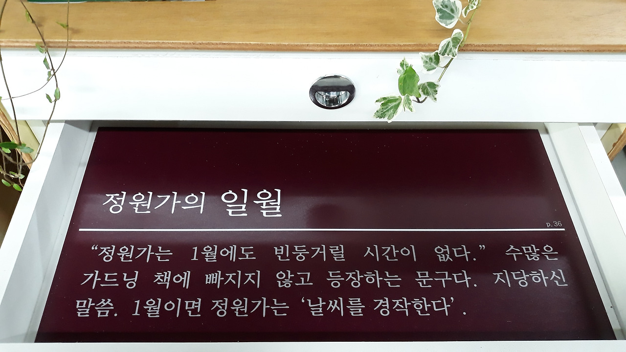 노들서가는 책 구경하고 차 한잔 하면서 쉬기 좋은 공간이었어요. 노들서가뿐만 아니라 주위에도 소소하게 즐길거리들이 있었어요. 노들서가 앞(?) 공간에는 '식물도'라는 곳이 있었는데 거기서 지금 하고 있는 '정원가의 열두달' 전시도 좋아요. 서랍을 열면 그 안에 '정원가의 열두달'이라는 책 안의 문구들이 적혀있어요. 저는 식물들에게는 죽음의 손이라 감히 정원가를 꿈꾸지는 않지만, 저의 삶에 대해서는 저도 열심히 일하는 정원가인 것 같아요. 올해 우리에게 주어질 1월부터 12월까지의 햇살, 비바람, 흙... 그런 것들을 생각해보면서 한번 돌아보시기에 좋은 전시예요.