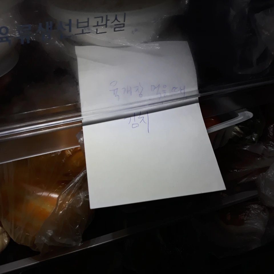 한참 울다가 물을 마시려고 냉장고를 열었는데 김치 그릇 사이에 종이 쪽지가 끼워져 있었다. 엄마의 글씨였다. ‘육개장 먹을 때 김치.’ 엄마는 서른 넘은 딸이 김치도 못 찾을까봐 쪽지를 써두고 간 거였다. 쪽지를 보는데 눈물이 났다. 아까 엄마가 점심밥 위치를 알려주려던 걸 흘려들은게 미안해져서 엄마가 육개장이 있다고 말한 곳으로 가봤다. 그런데 거기에는 육개장 사발면이 있는게 아니라 진짜 육개장이 있었다.