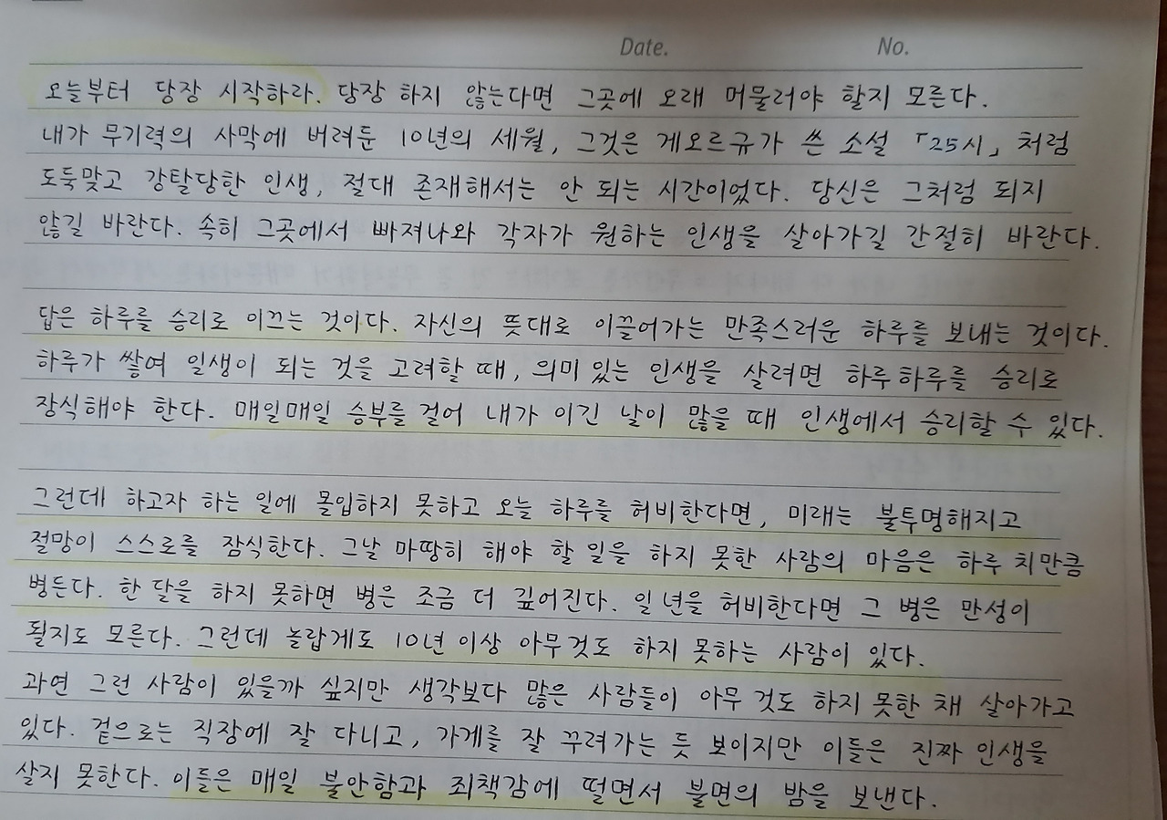 나는 무기력에 관한 저 발췌문들을 힘이 들 때마다 옆에 놓고 봤다. 아무런 변화도 없었다. 나는 책에 적힌대로 해보려고 했지만 아무것도 할 수 없었다. 다 맞는 말인 줄은 머리로는 아는데 행동으로는 옮길 수 없었다.
