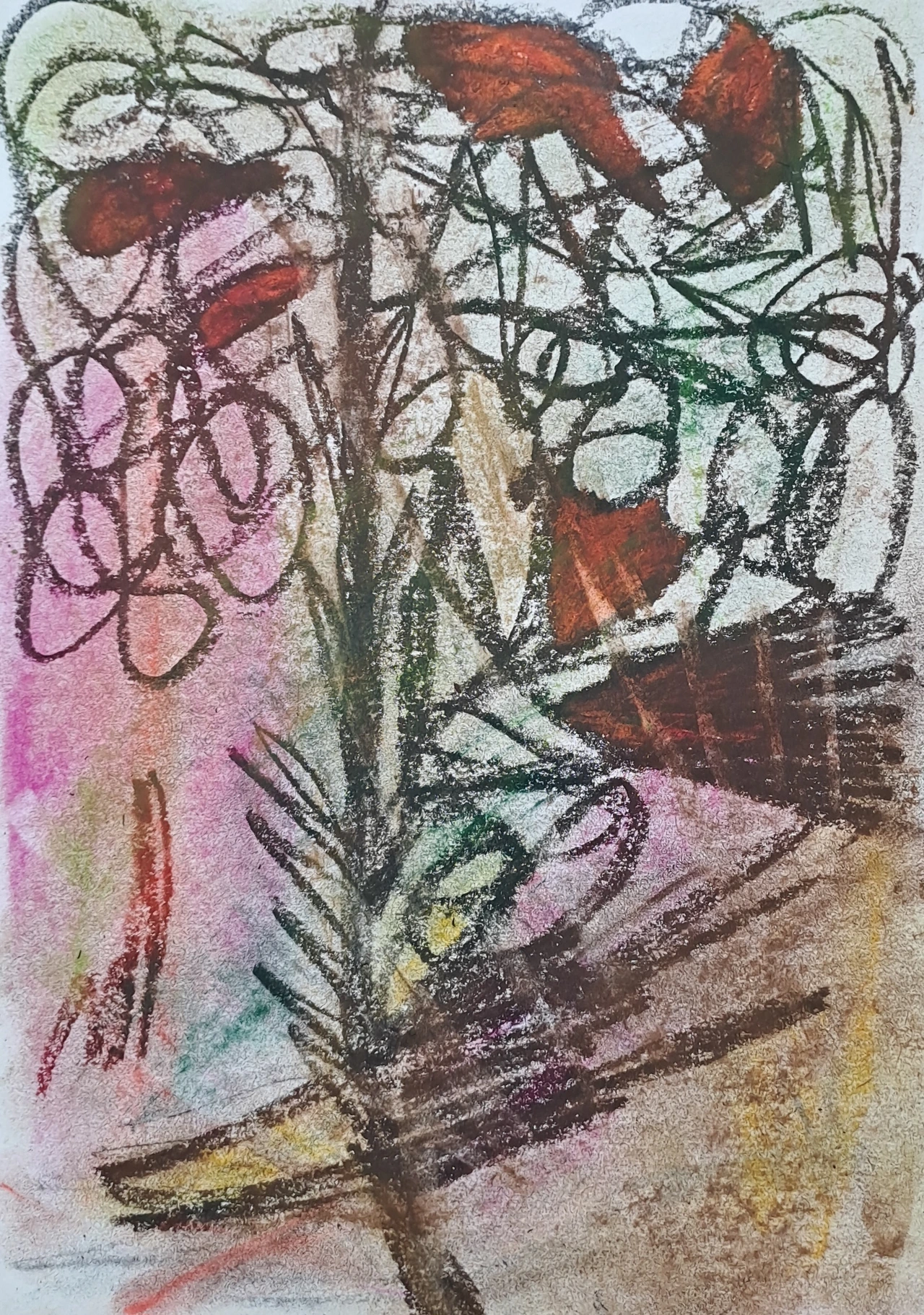 재료들로 선을 긋고 연습하는 시간이었는데 오늘따라 나무를 그리고 싶었다. 먼저 오일 재료들로 연습을 해봤는데 지울 수 없는 선과 면들이 왠지 부담스러웠다.