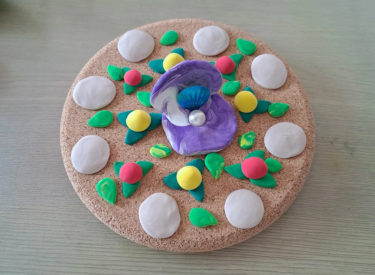 그 다음에는 원형 코르크 판 위에 나를 가장 편안하게 하는 것들을 만드는게 과제였다. 나는 정원을 만들었다. 맨 처음엔 유토로 만든 돌을 얹었다. 개방적이지만 보호받는 울타리가 필요했다. 울타리 안은 내가 가장 좋아하는 색들, 빨강, 노랑, 초록으로 채웠다. 바닥에 널린 꽃과 열매, 잎들.