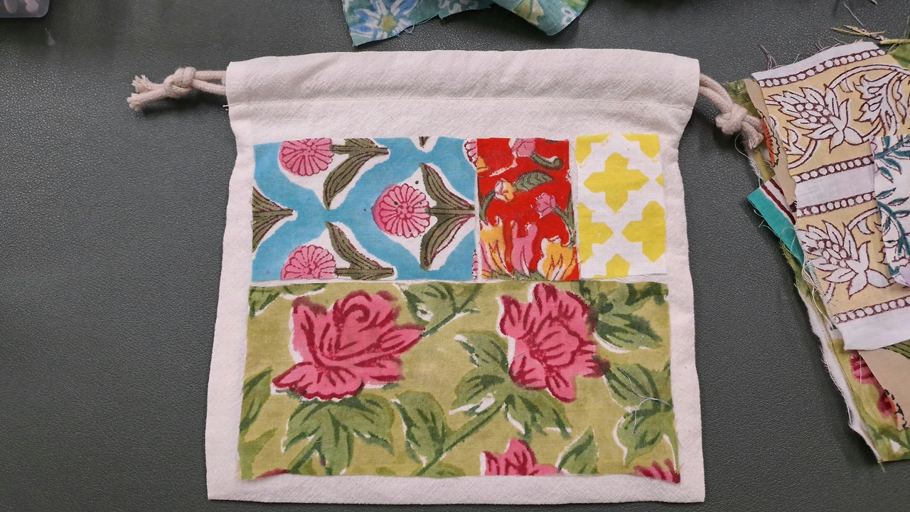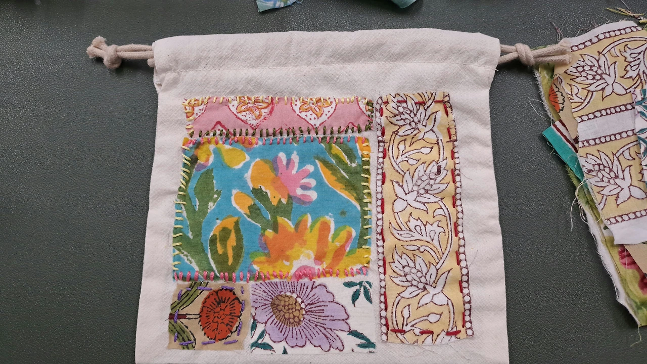 광목 주머니에 인도 원단 조각들을 배열해서 바느질하는 작업이었다. 처음에 간단한 바느질을 배우고 시작했다. 각자의 결과물이 다 달라서 보는 재미가 있었다. 취향에 따라서 원단 선택, 배열이 달라졌다.