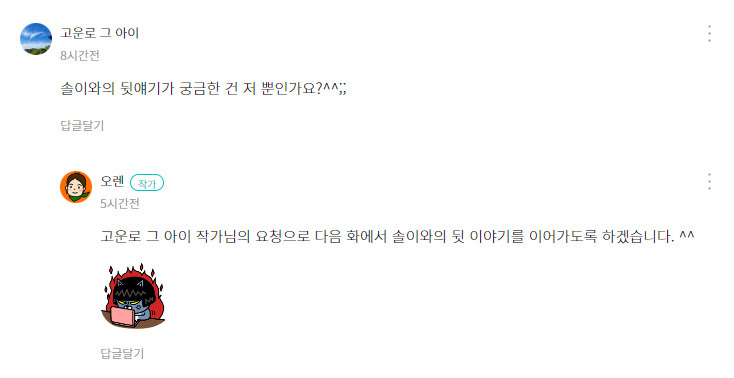 이것으로 비둘기 롤라장과 뮤즈 음악 감상실에서 시작되어 3년간의 편지로 마무리되었던 이야기는 완성되었다. 이쯤에서 솔이와의 뒷 이야기를 궁금해해 주신 고운로 그 아이 작가님께 다시 한번 감사드린다. 작가님이 궁금해하지 않으셨다면 이 글은 쓰여지지 않았을지도 모른다.