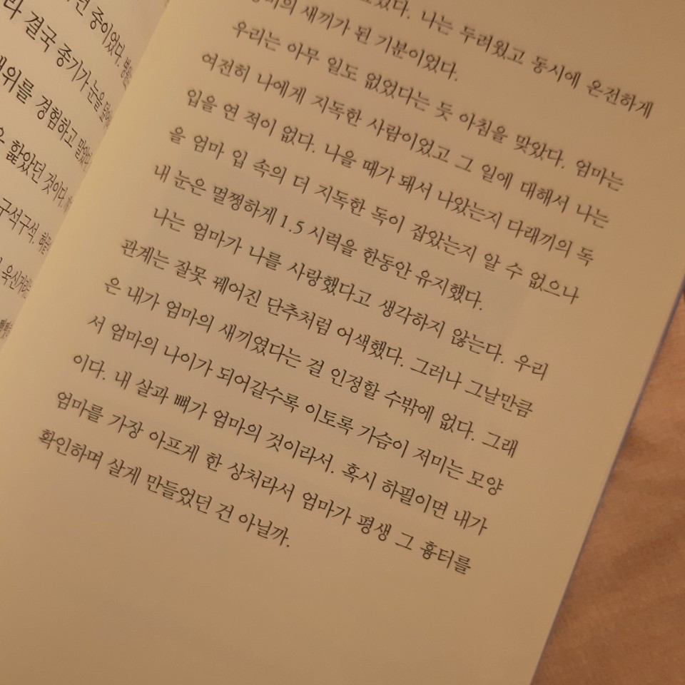 나는 엄마가 나를 사랑했다고 생각하지 않는다. 우리 관계는 잘못 꿰어진 단추처럼 어색했다. 그러나 그날만큼은 내가 엄마의 새끼였다는 걸 인정할 수밖에 없다. 그래서 엄마의 나이가 되어갈수록 이토록 가슴이 저미는 모양이다. 내 살과 뼈가 엄마의 것이라서. 혹시 하필이면 내가 엄마를 가장 아프게 한 상처라서 엄마가 평생 그 흉터를 확인하며 살게 만들었던 건 아닐까.