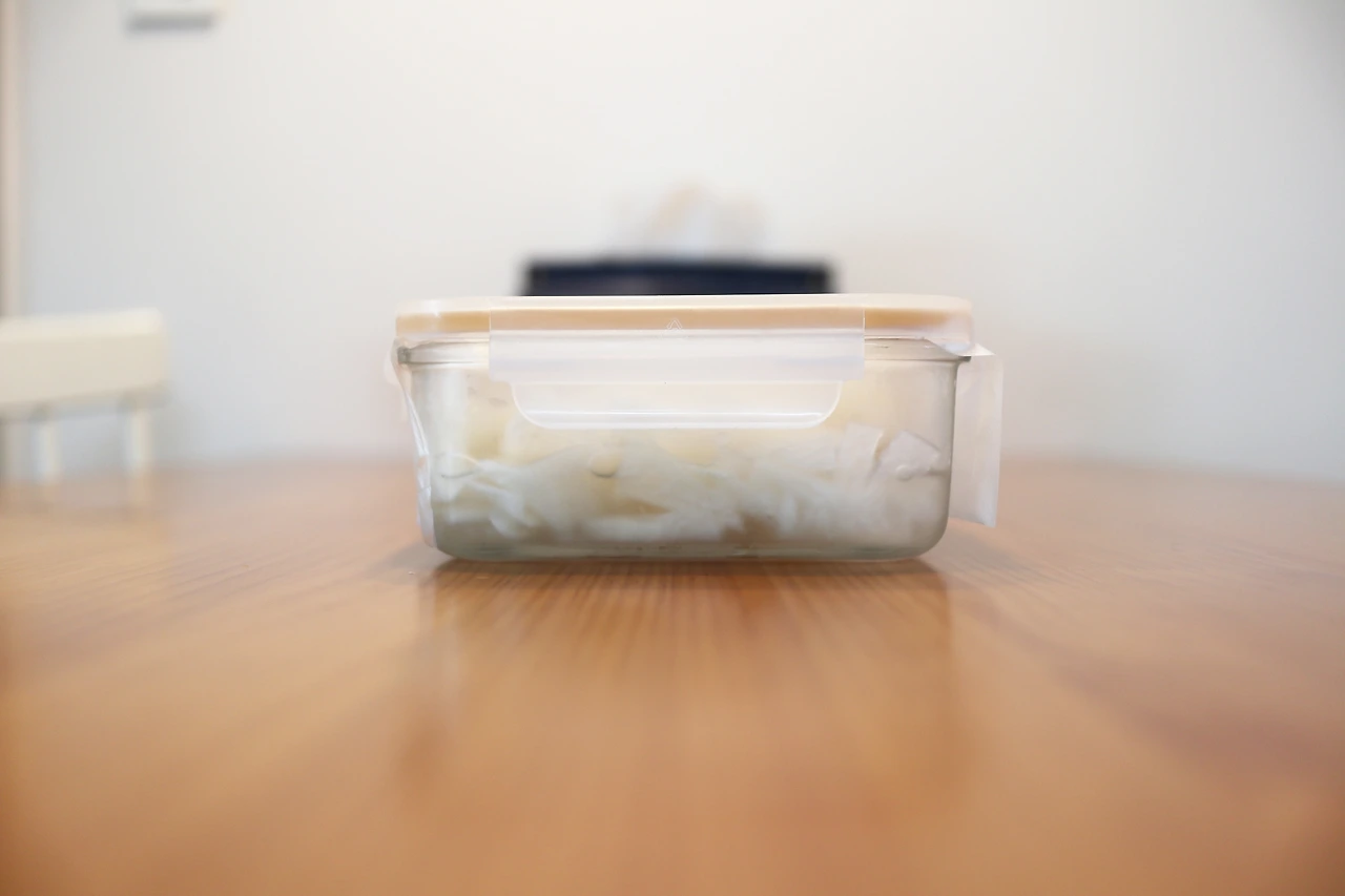 냉장고에 배합초 냄새가 날까봐 비닐을 한 꺼풀 씌우고 뚜껑을 덮습니다.