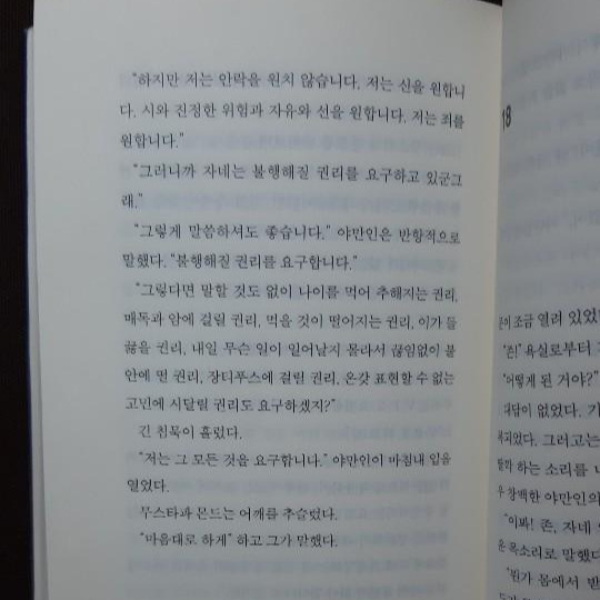 “하지만 저는 안락을 원치 않습니다. 저는 신을 원합니다. 시와 진정한 위험과 자유와 선을 원합니다. 저는 죄를 원합니다.”