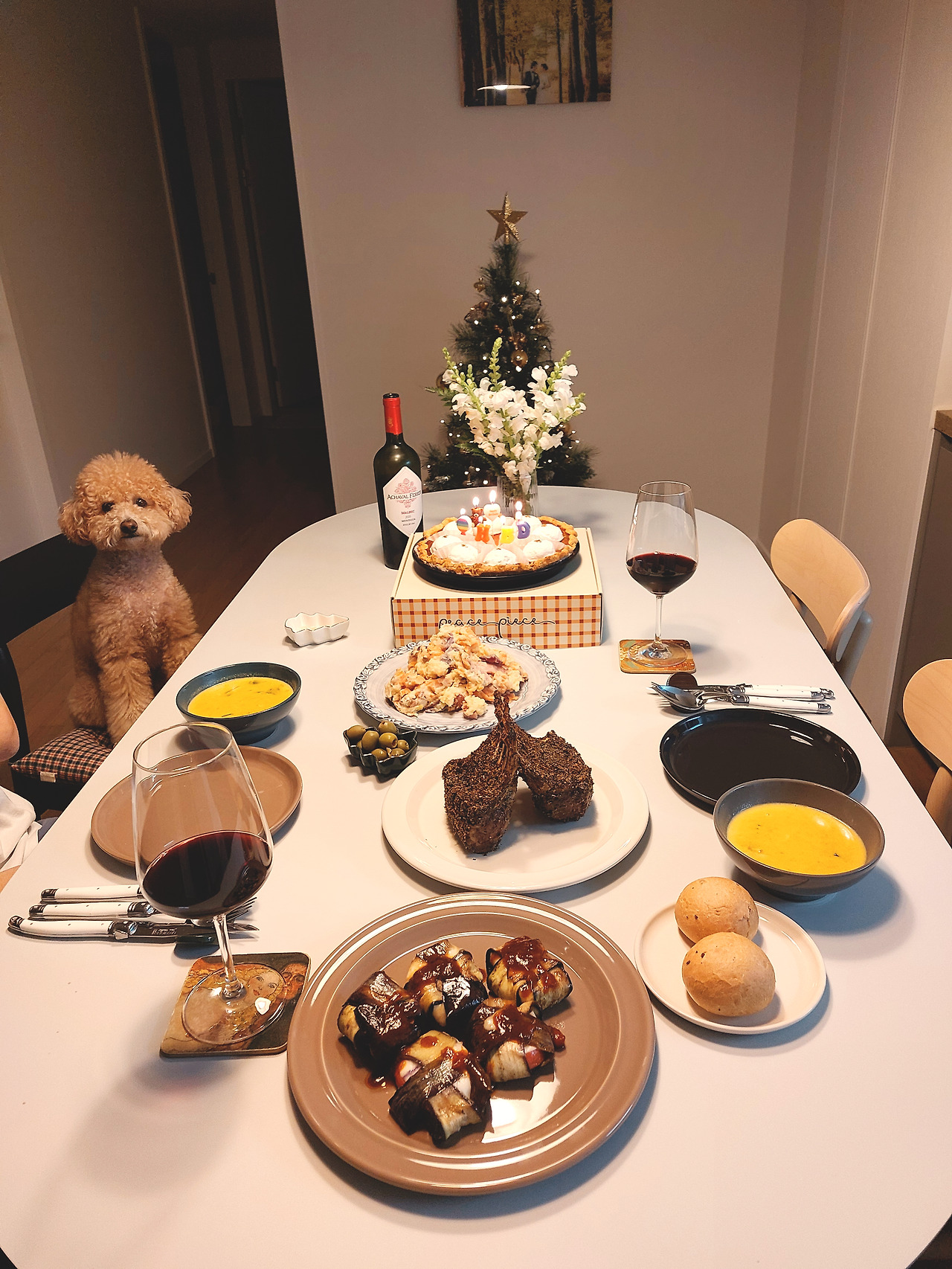 올해 남편의 생일상. 모카도 함께 축하해준다..