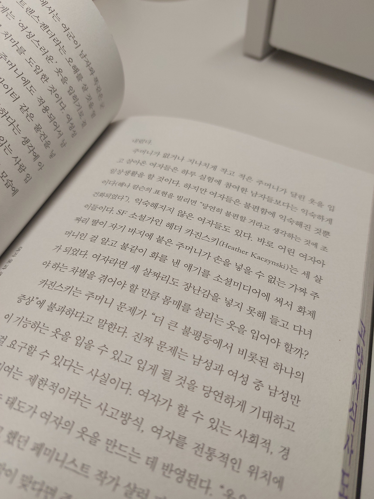 그런데 이번에 책을 읽고 나니 내가 왜 주머니와 가방 타령에서 번번이 속이 꼬이고 거슬렸는지 알 것 같았다. 여성을 한정 짓는 것. 여성을 보조적인 입지로 내려다보는 시선. 그러한 것에 늘 열패감을 느꼈기 때문이었다.
