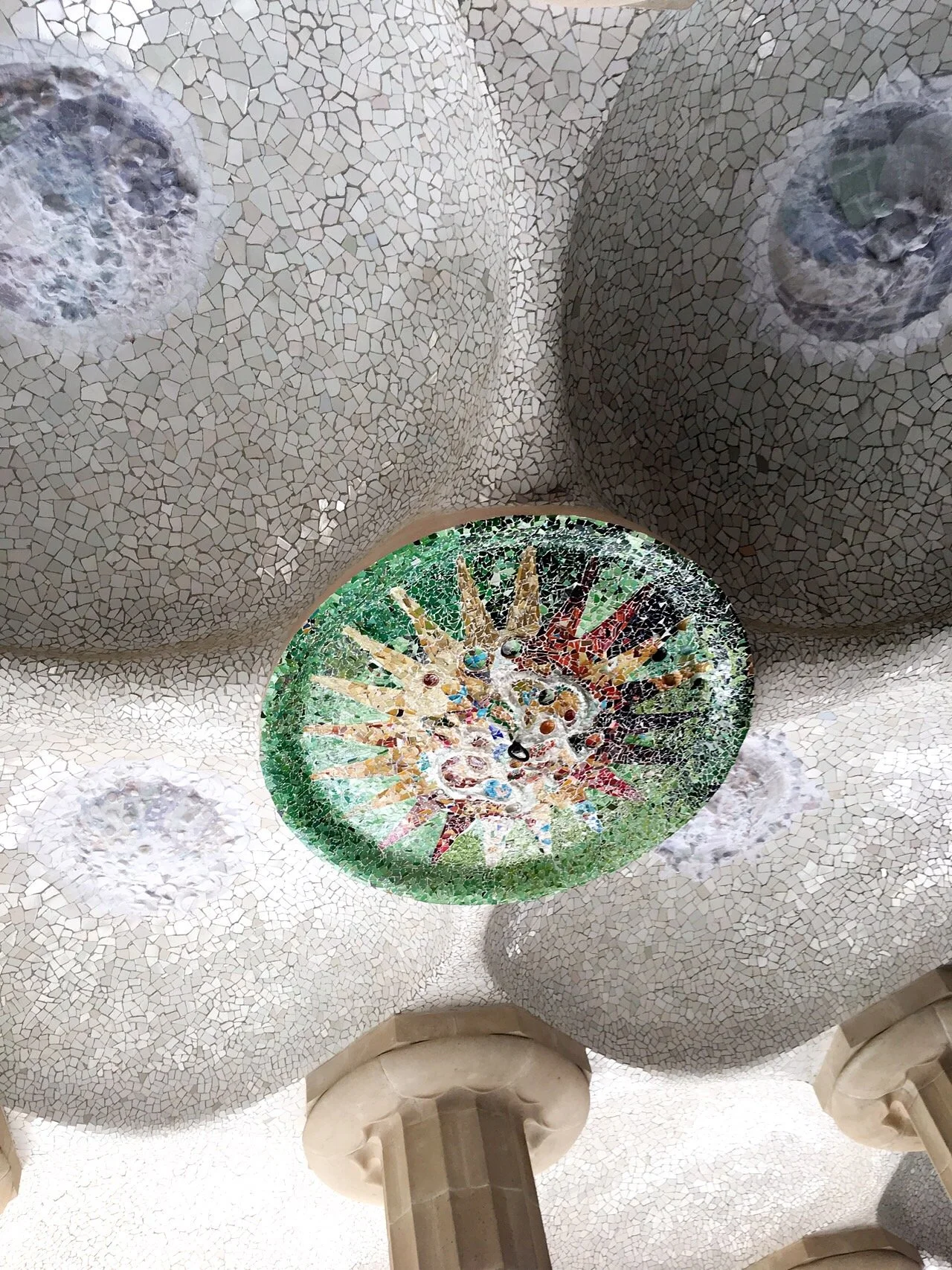 오른쪽에 있는 구엘 공원의 천장은 비가 오면 구를 따라 빗물이 기둥 쪽으로 모이고 기둥의 구멍을 따라 밑으로 흘러내리도록 효율과 미학을 동시에 추구하는 디자인으로 만들어졌다.