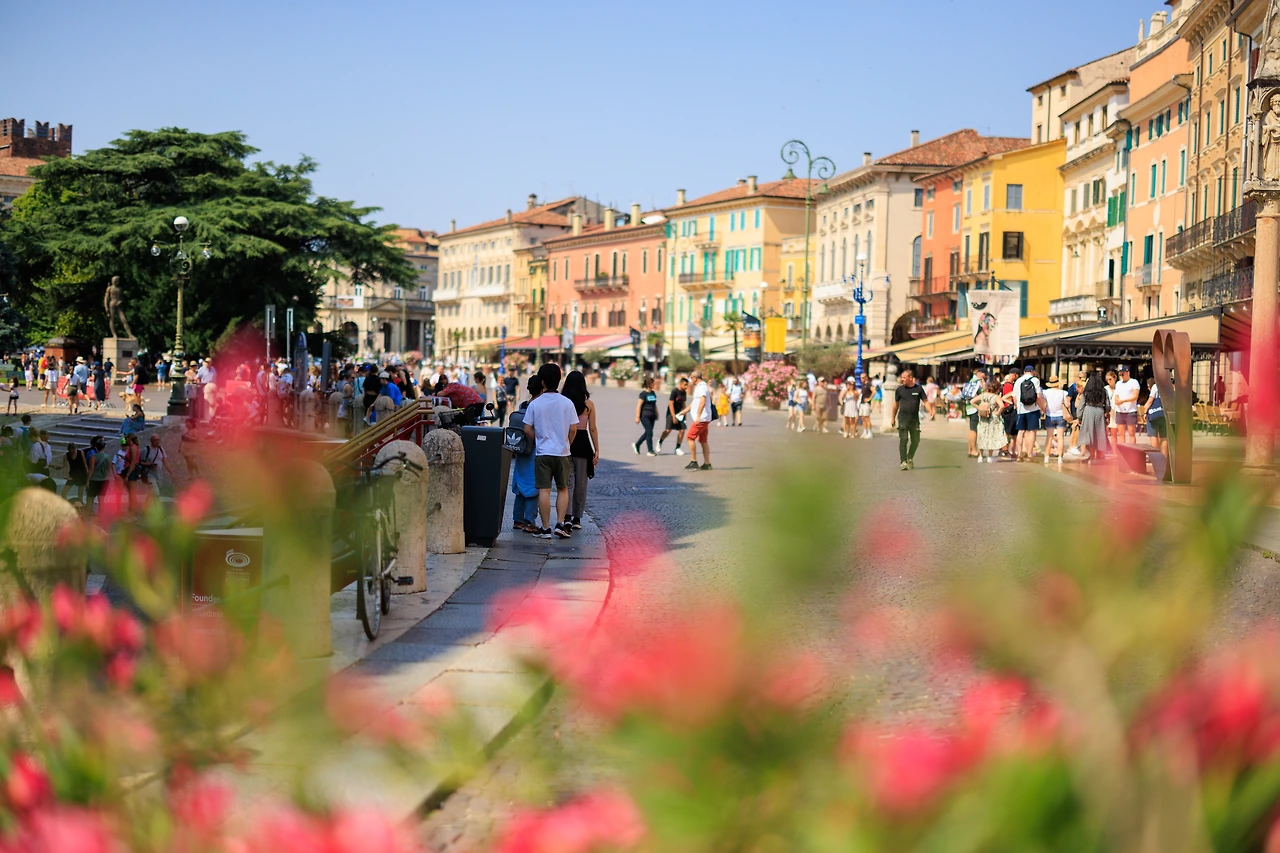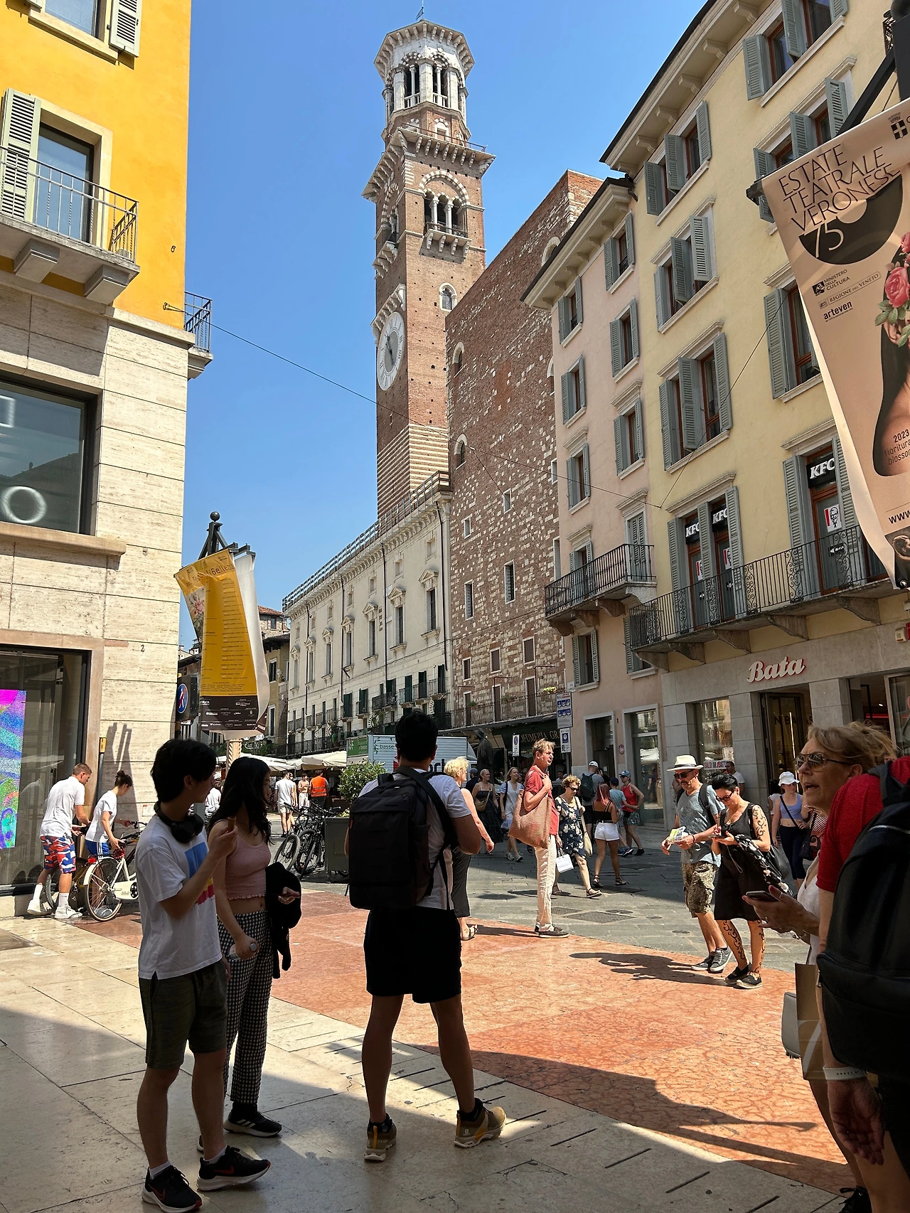 에르베 광장(Piazza delle Erbe)과 시뇨리 광장(Piazza dei Signori)을 향해 골목 산책. 람베르티의 탑(Torre dei Lamberti)이 있는 허브광장이라는 뜻의 에르베 광장에는 상시 마켓이 열려 구경거리가 많다. 과일 등 먹거리와 작은 소품부터 옷까지… 가볍게 쇼핑을 하고 한낮의 땡볕을 살짝 피하기 위해 호텔로 향했다. 해가 기울어지면 다시 나오기로 하고…