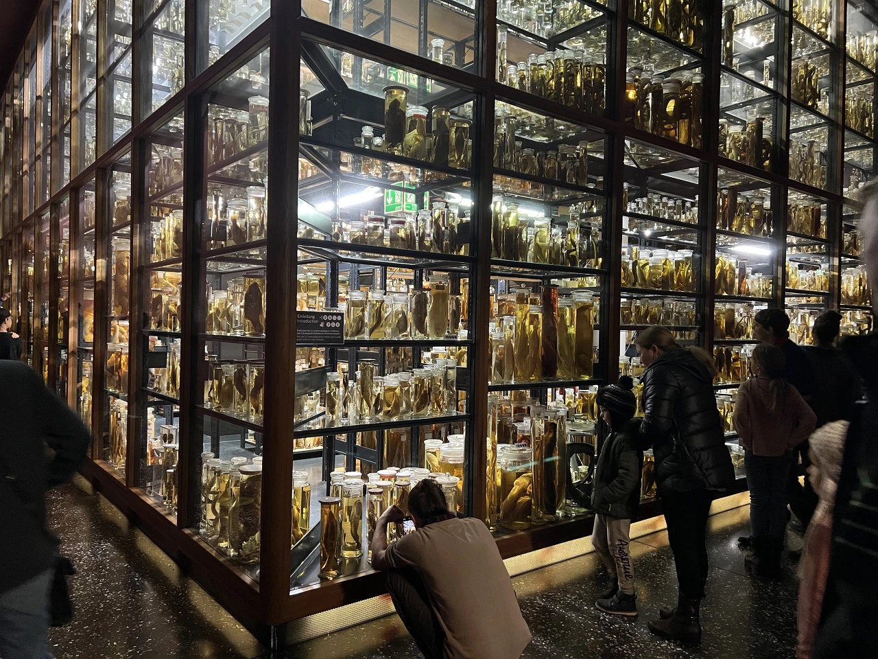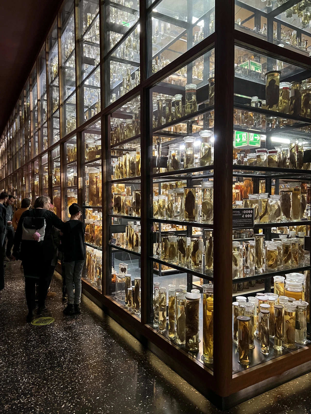 ‘wet collection’ 구간에는 셀 수도 없이 많은, 한때는 생명체였던 것들이 본연의 색을 잃고 모두 비슷한 희뿌연 존재로 노리끼리한 투명 보존액에 담겨 진열되어 있다. 엄청나게 넓고 높은 방을 열을 지어 채우고 있는데, 사실 끔찍해서 자세히 볼 수도 없었을뿐더러 시간이 꽤 지나고 나면 저 안에 지금의 인간이 있지 말란 법이 있나…라는 생각이 들어 가능한 서둘러 지나칠 수밖에 없었다. 그저 이 방 하나가 거대한, 죽음으로 멈춰버린 생명체와 같이 느껴졌다면 다소 오버일까.