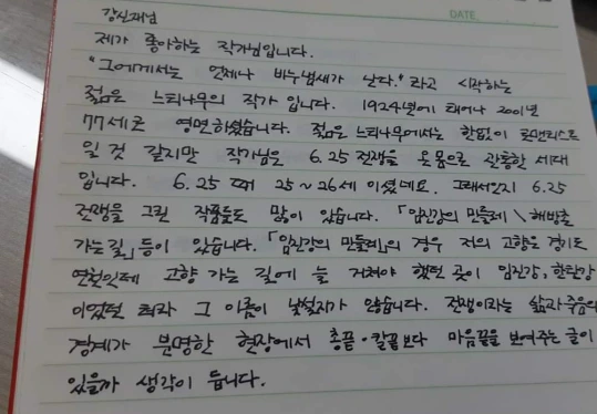 특히 ‘임진강의 민들레’는 젊은 여성이 전쟁 속에서 겪는 생생한 현장감과 눈앞에도 그려지는 상황이 글을 읽는 동안 가슴이 먹먹했던 작품이었다.