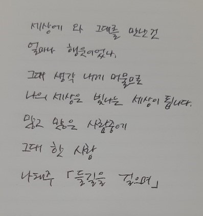 이번 기회로 감사한 점을 한 가지 더 깨닫게 됩니다. 좋아하고 감사하다면 그 마음 누르지 말고 많이 표현할수록 더 살뜰한 관계가 된다는 것입니다. 원론적인 이야기지만 결국 돌아 돌아 모든 해답을 알고 있음에도 행동하지 못했다는 결론입니다. 그렇기에 저는 제가 함께하고 싶은 관계들에 먼저 손 내밀고, 고맙다고 그리고 내가 늘 응원하고 있다고 표현할 생각입니다. 그리고 허락해준다면 좋은 인연을 계속 가져가고 싶다고 말하고 싶습니다.