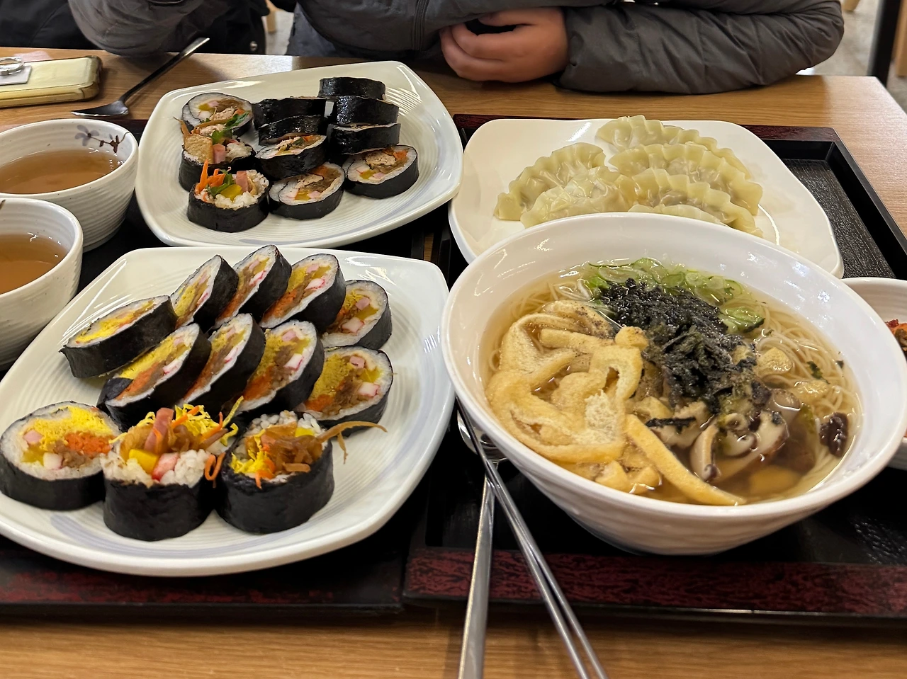 음식이 나온 순간 욕심이 과했다고 생각했다. 김밥 한 줄 가격이 멸치국수 가격과 같아서 김밥 가격이 조금 과하게 느껴졌는데 나중에 나온 김밥 크기를 보고는 납득이 갔다. 많다고 호들갑 떨던 게 무색하게 둘이서 주문한 메뉴를 모두 먹었다. 먹다 보니 다 들어갔다. 만족스럽게 부른 배를 두드리며 공양간을 나온다.