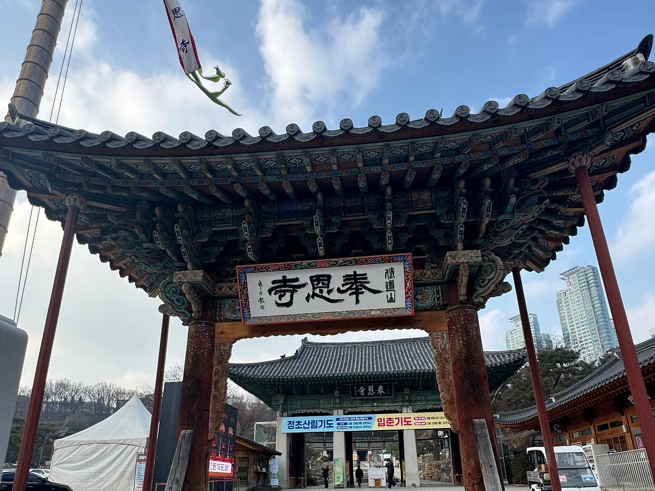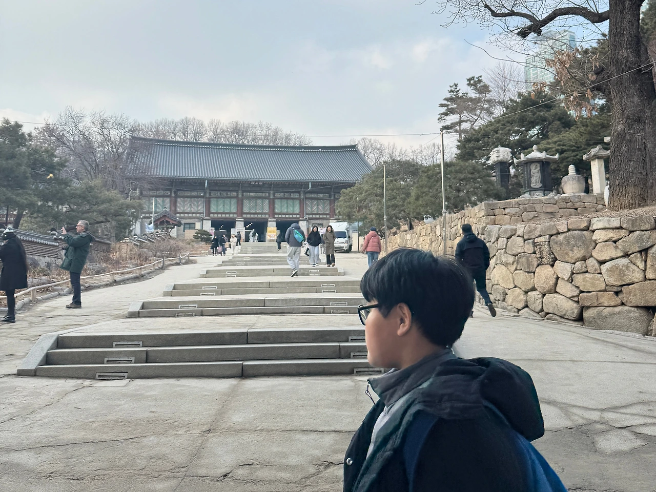 절 입구를 지나 사천왕문에 인사를 하고는 천천히 안으로 들어간다. 아이가 예전 기억을 더듬어 이쯤 어딘가에 달마상이 있던걸 이야기한다. 두런두런 아이와 이야기하며 경내를 둘러본다. 강남 한복판에 있는 절이라 그런지, 케데헌의 영향인지 여기저기 외국인 관광객들이 많았다. 강북 한복판에 있는 조계사 입춘법회 때와는 다른 분위기다.