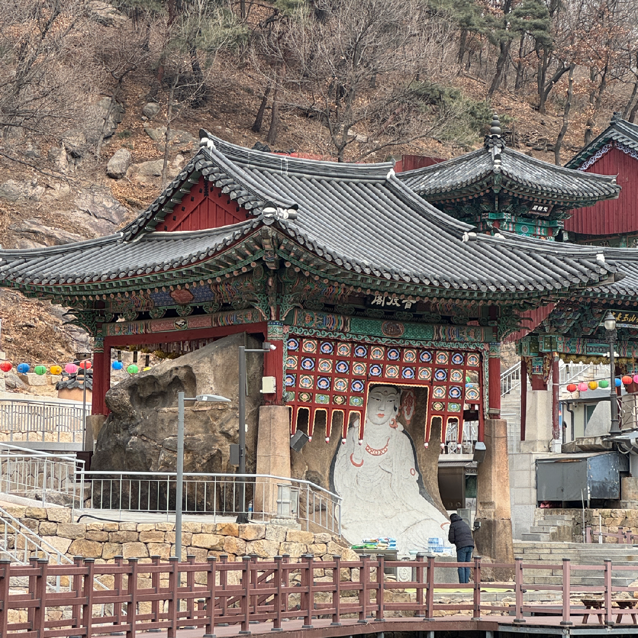 작은 천 위로 난 다리를 건너 옥천암으로 들어선다. 옥천암 아래 천변으로 엄청 큰 바위에 부처님의 형상이 새겨져 있어 눈길을 끌었다. 찾아보니 해수관음상이란다.