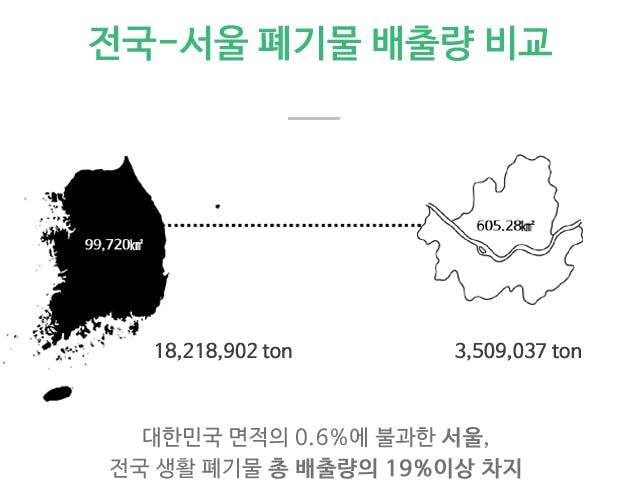 자료(상단)에 따르면 실제로 포장재의 약 70%는 폐기물이 되어 자원 낭비와 환경오염의 주범이 된다. 2009년 환경부가 내놓은 통계에서는 생활폐기물 중 포장 쓰레기가 무려 32%(중량 기준, 부피기준으로는 50%)를 차지하는 것으로 나타났다. 거기에 서울은 사정이 더 심하다. 대한민국 면적의 0.6%에 불과한 서울의 생활 폐기물 배출량이 전국 배출량의 19% 이상을 차지한다. 인구 밀도가 높아서 그렇다 치자. 그렇다면 대체 이 많은 쓰레기는 어디로 가는 것일까. 쾌적한 지금의 월드컵공원이 쓰레기 더미를 덮어 만든 것이라고 하면 누가 믿기나 할까. 그런데 진짜다.