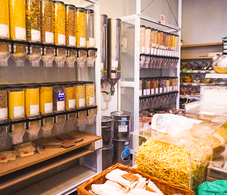 슈퍼마켓을 이용하는 방법은 간단하다. 본인이 덜어 갈 용기를 가져가거나(홈페이지엔 안경케이스도 활용이 가능하다고 되어 있다), 재활용 가능한 백이나 병을 구입하면 된다. 사실 담아가는 것이라서 곡물이나 견과류 정도만 판매할 것이라고 생각했는데, 온라인 쇼핑몰에는 소다나 세척제 같은 생활용품도 종이 포장지에 담겨 있는 상태로 판매한다. 아마 오프라인 몰도 가능하지 않을까 싶다.