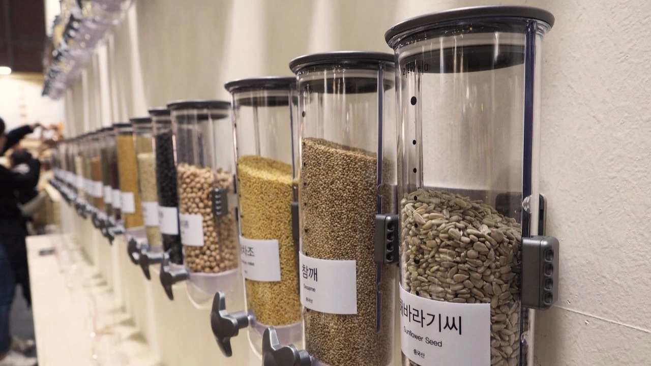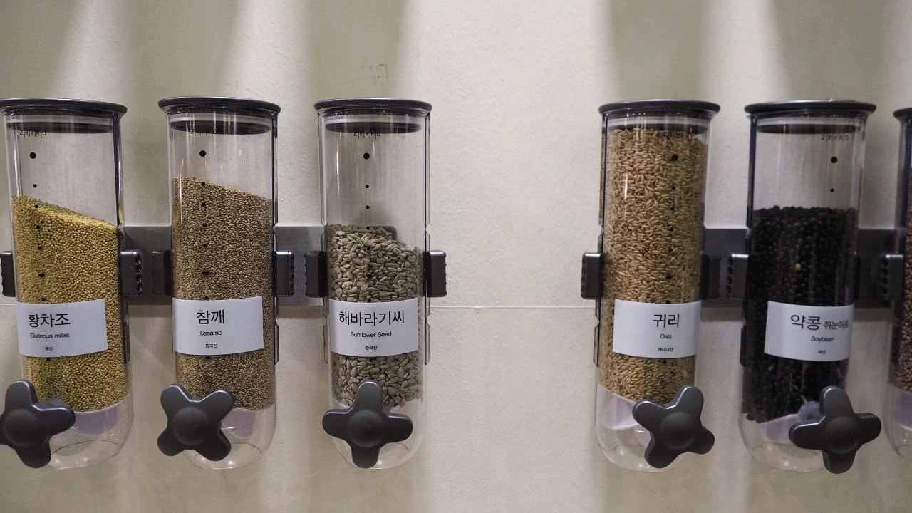 이용 방법은 병을 골라 원하는 곡물이나 견과류를 고르면 됩니다. 시범 마켓이라 종류가 많지 않았습니다.