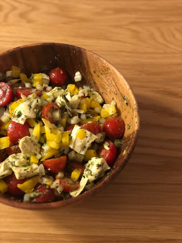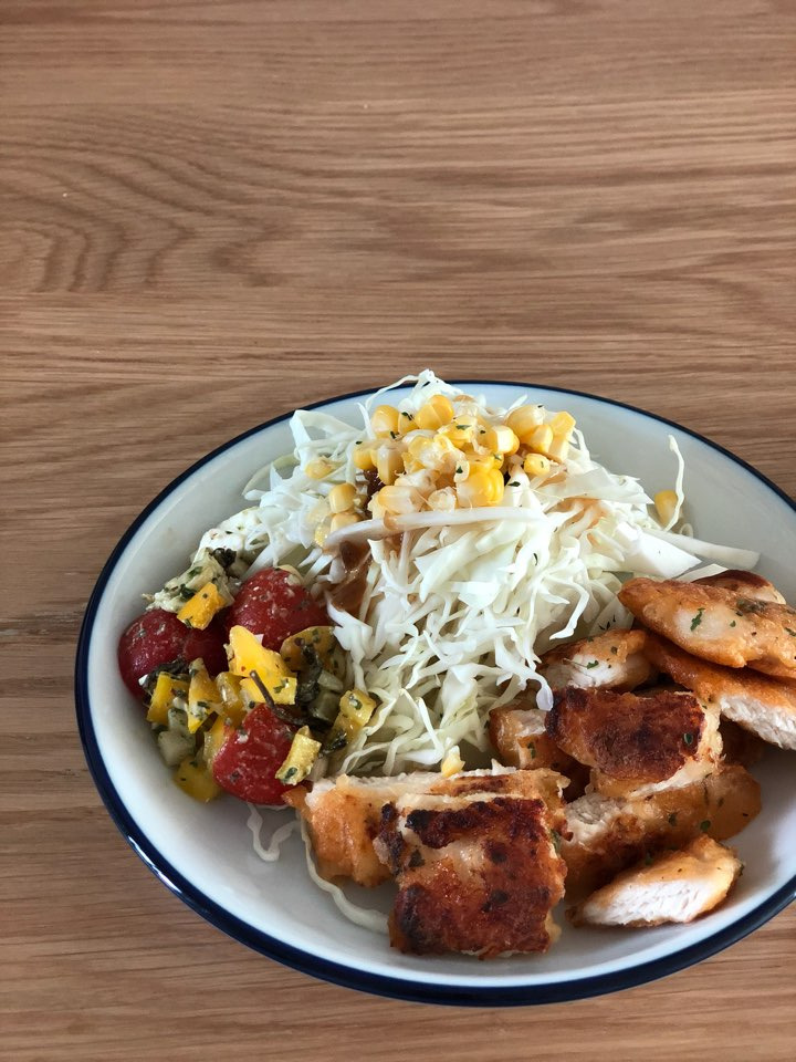 조금 더 맛과 정성을 더해보자면, 방울토마토, 양배추, 양파 등의 여름 채소 잔뜩, 여기에 옥수수 알갱이, 치즈(없으면 패스), 바질을 넣어 올리브유에 버무린다. 소금과 후추로 간을 맞추고 반나절은 잊고 지낸다. 꺼내어 그냥 먹어도 좋고 펜네를 곁들이면 초간단 제철 콜드 파스타 완성!