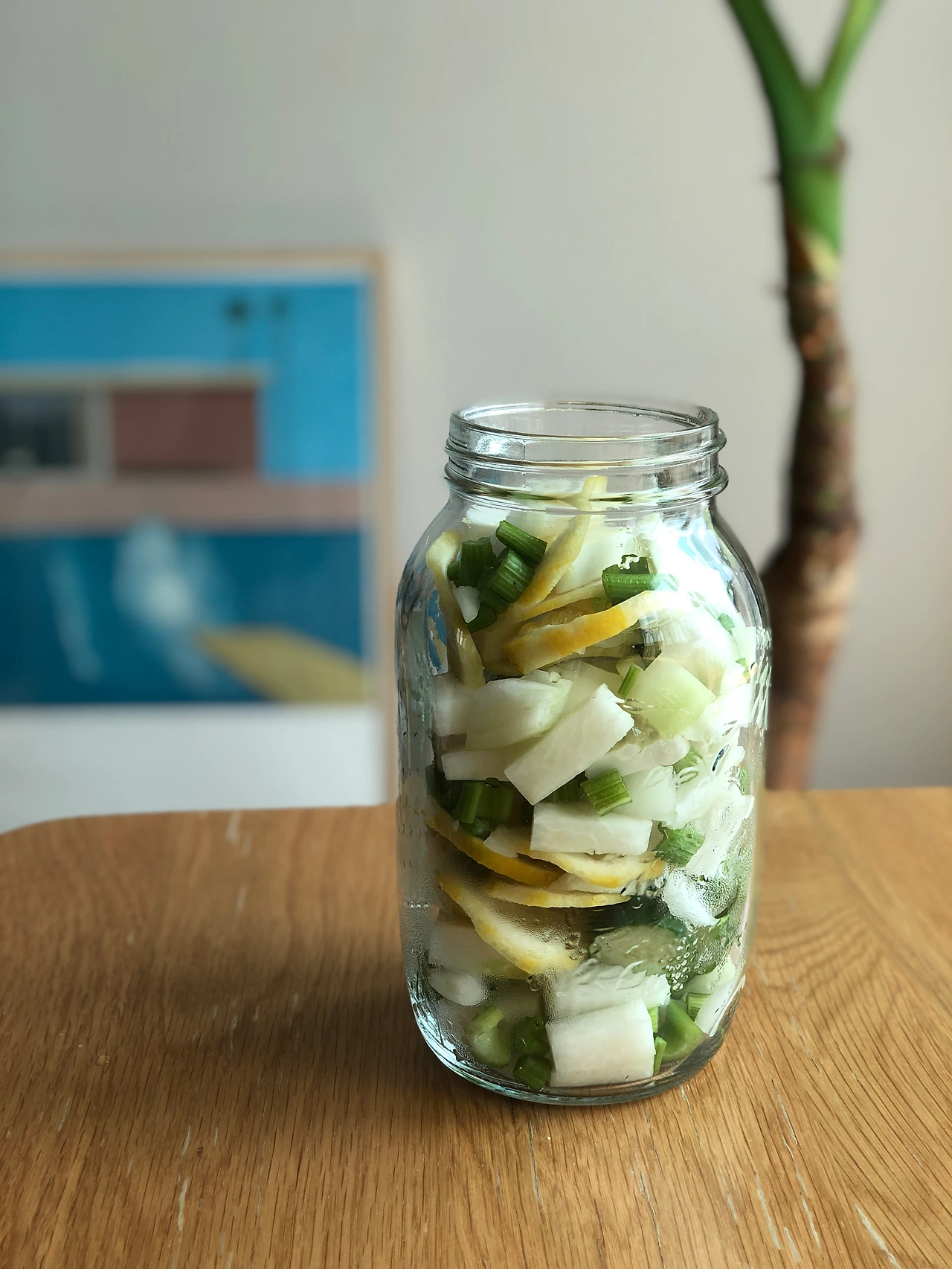 그렇게 다 없어질 것만 같았던 채소가 또 남았다. 이럴 땐 아무래도 피클만 한 것이 없는 것 같아 집에 남은 식초를 탈탈 털어 촛물을 만들어 붓고 며칠 식혀두었다. 여기에 슬라이스 한 레몬을 넣는 것을 추천!