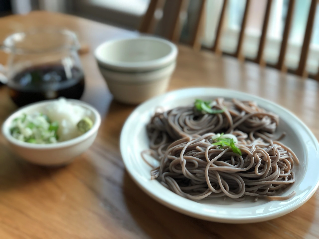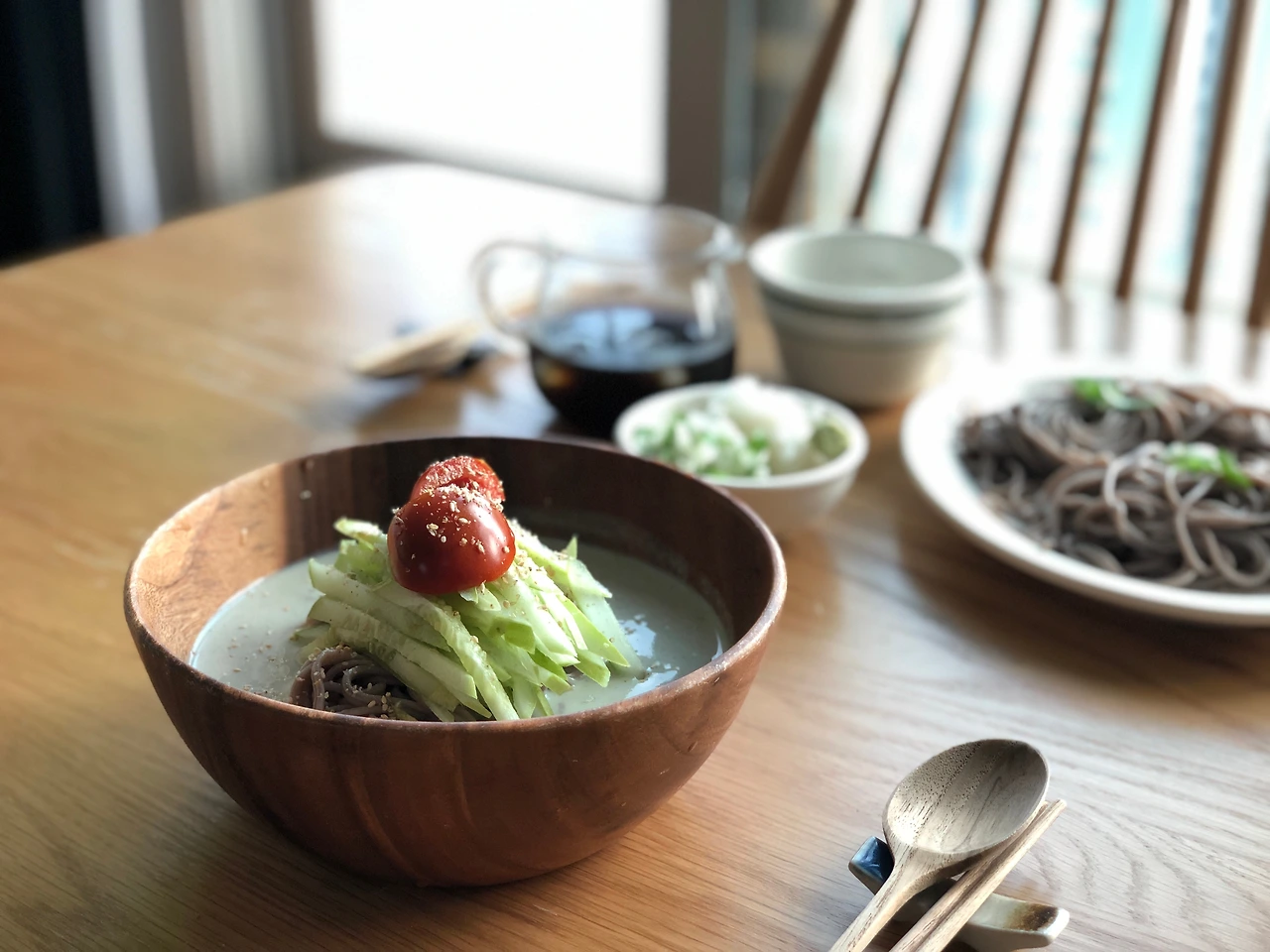 몇 시간을 주방에 있었는지 모를 이 토요일의 점심 겸 저녁은 메밀면이었다. 아무리 생각해도 100퍼센트 제주 순메밀은 정말 맛 천재인 것 같다. 여기에 콩물을 붓고, 쯔유를 희석해 시원하게 말아먹었다. 사실 한 달 전부터 사다둔 건데 귀찮다는 이유로 차일피일하다가 드디어 먹게 된 것이다. 이날 오전에 시작한 벼락치기 여름 요리는 결국 늦은 밤이 되어서야 끝이 났다.