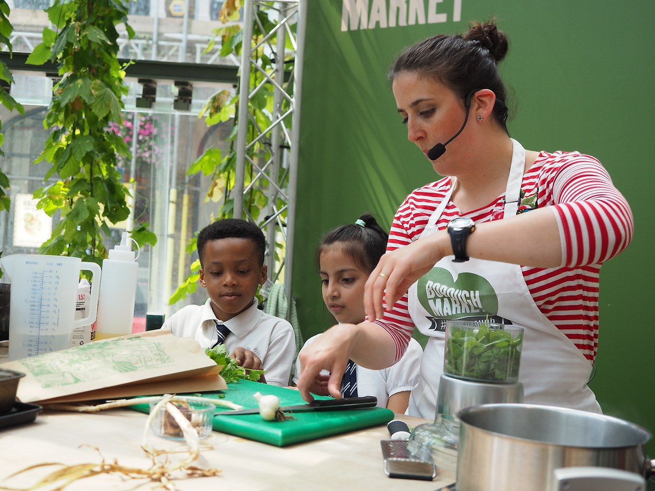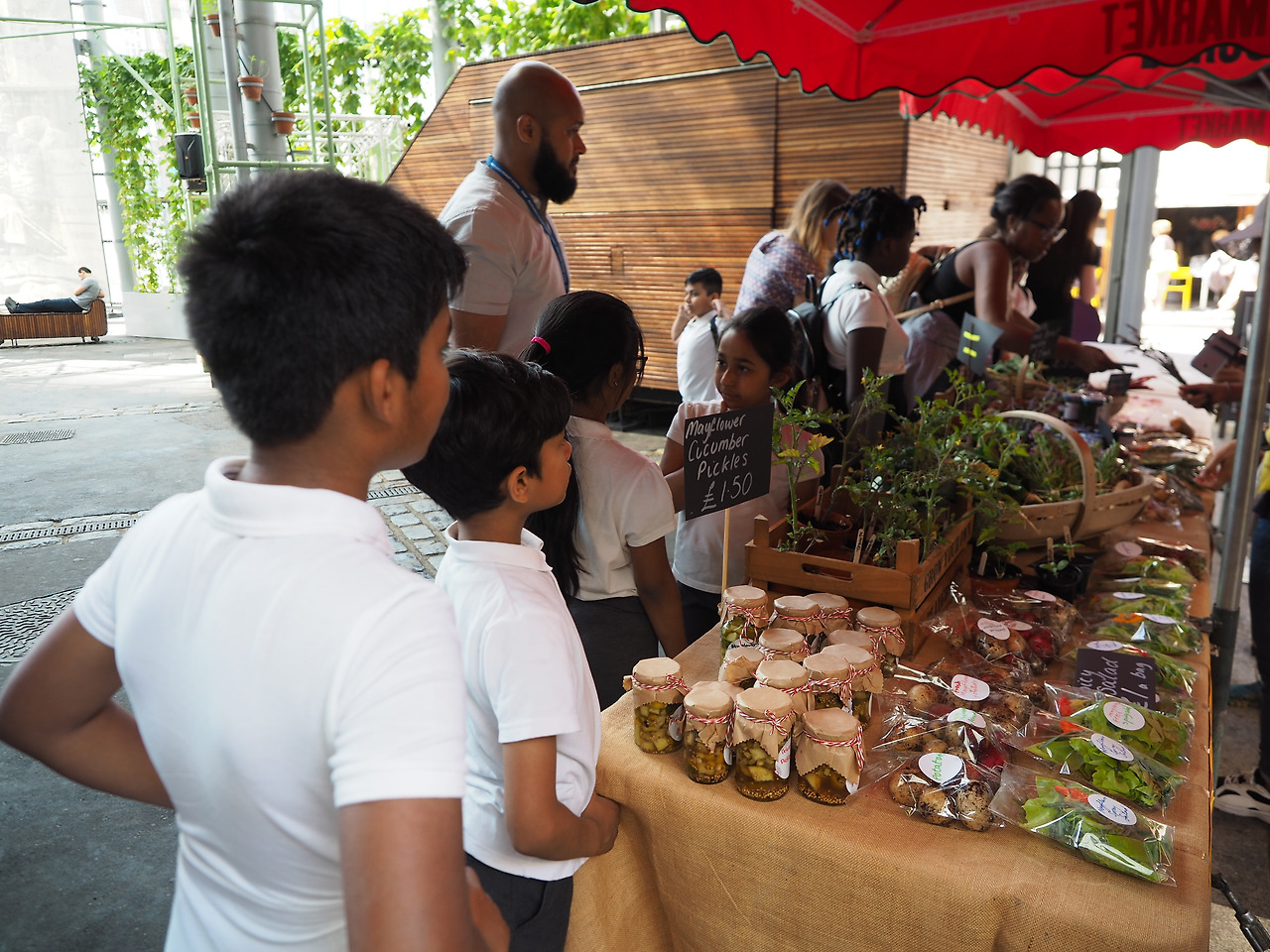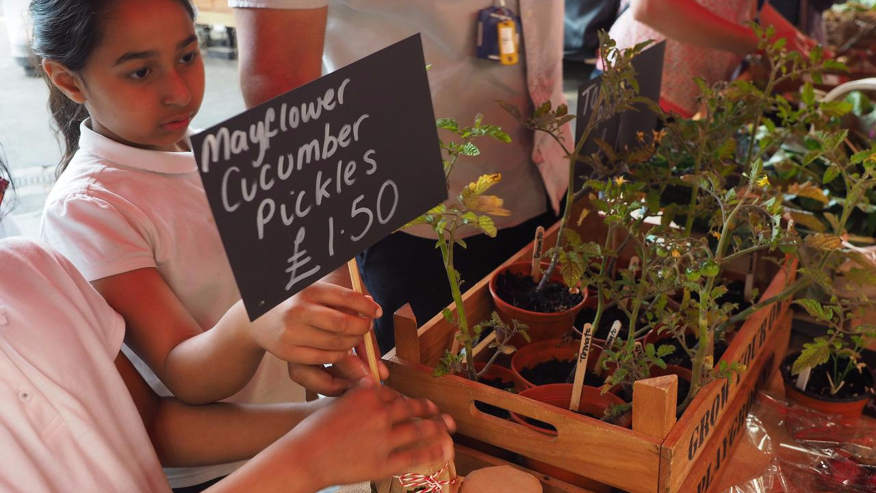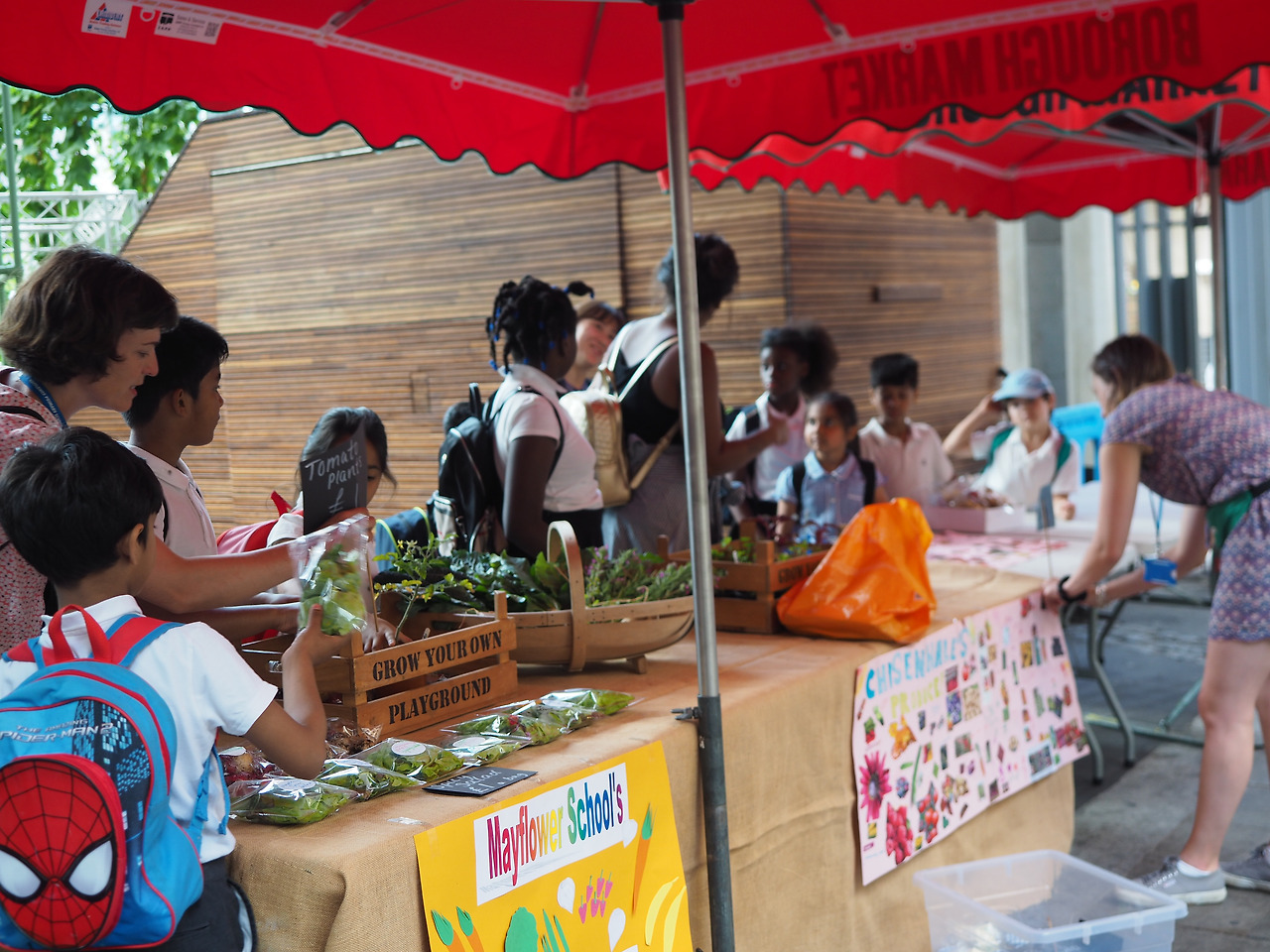 또 하나 특이한 점은, 인근 초등학교 학생들이 학교 안에 있는 텃밭에서 가꾼 채소를 들고 와서 직접 판매한다는 것입니다. 실제 영국 교육과정에는 텃밭 수업과 이런 관련 체험 과정이 있다고 해요. 아이들은 채소 봉투에 직접 만든 스티커를 붙이고, 진열하고 판매하는 것까지 모든 과정을 함께 합니다. 참여한 선생님이나 아이들이나 매우 들떠 보입니다. 꽤 진지한 아이들의 표정도 재미있습니다.