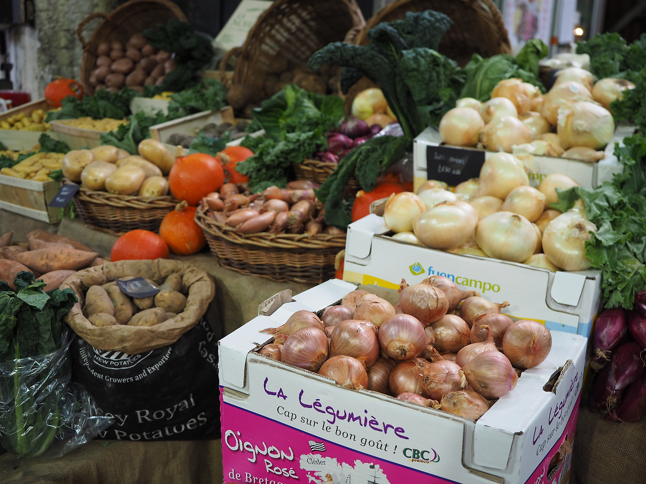 형형색색인 채소를 매대에 올린 방식도 다양합니다. 먹음직스러워 보입니다.
