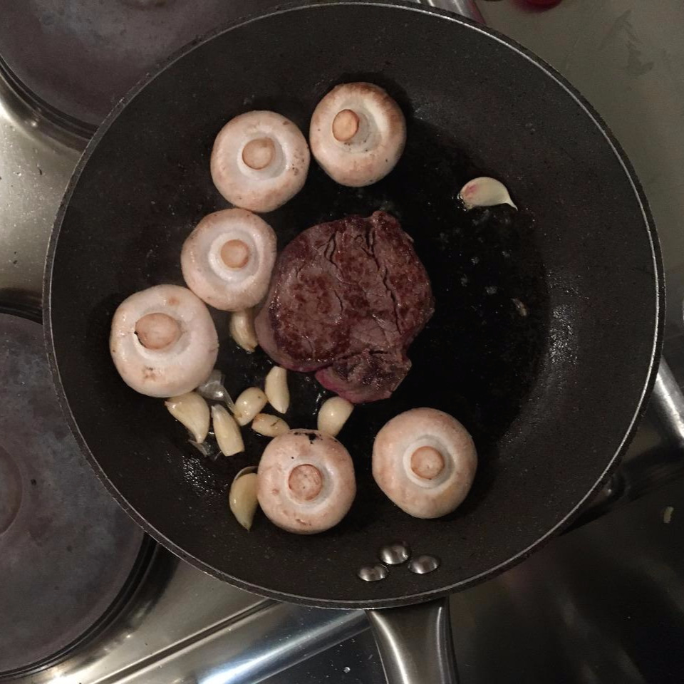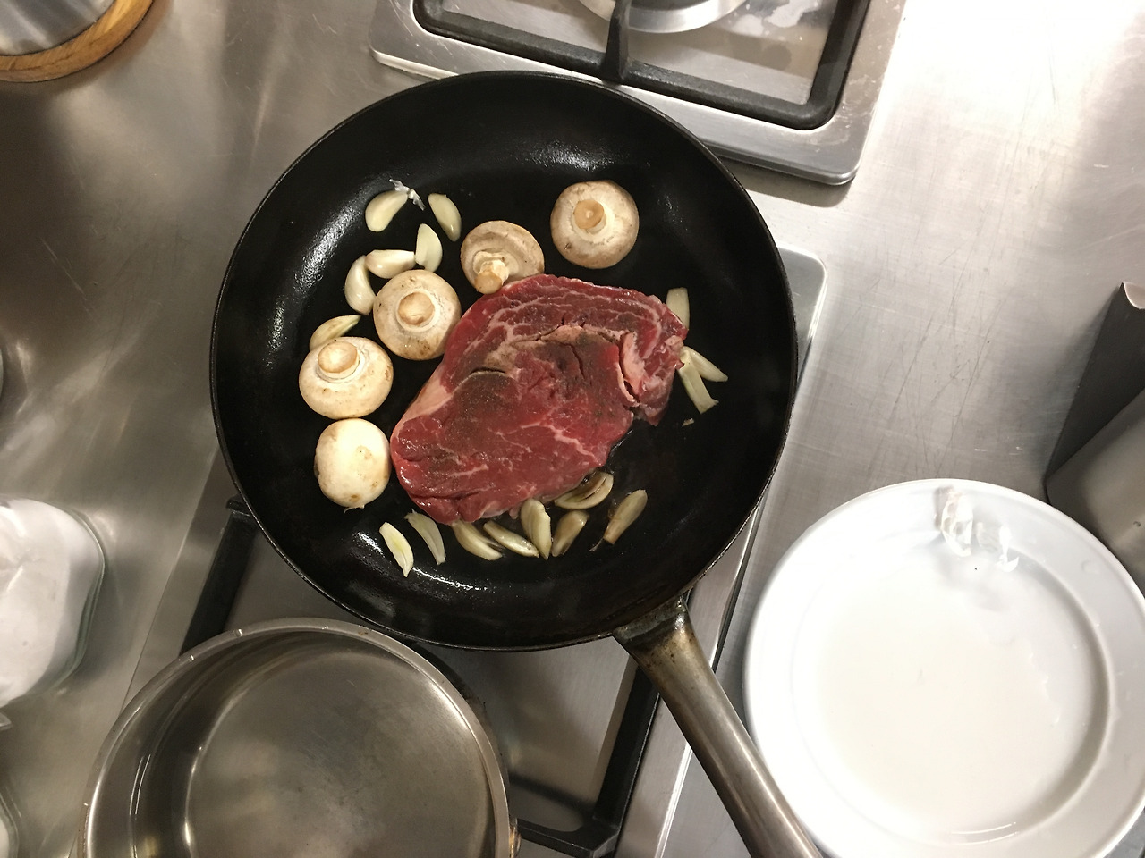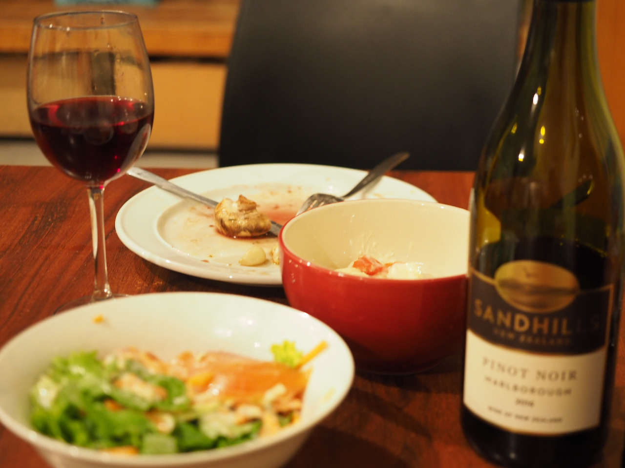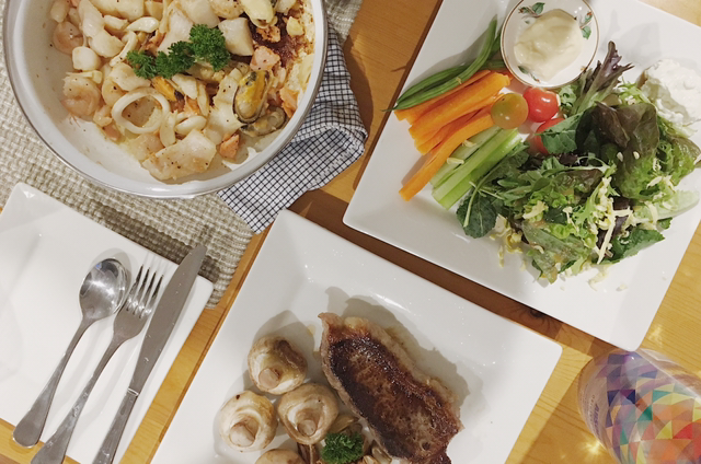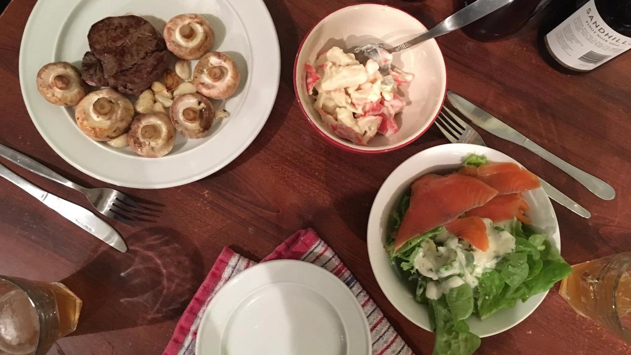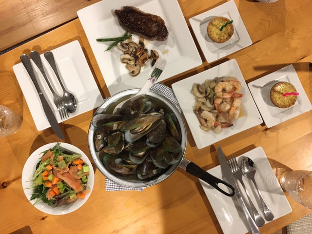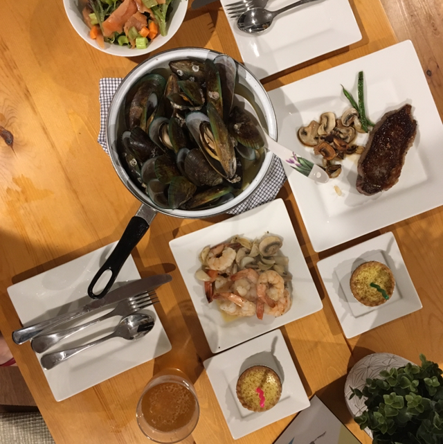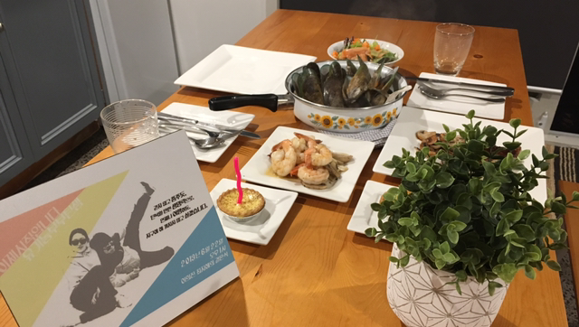 되는대로 오일을 둘러 왕새우를 볶고, 그린 머슬은 쪘습니다. 넘편은 역시나 스테이크를, 저는 연어 샐러드를 맛있게 먹었습니다. 비싼 레스토랑에서 보다 더 즐겁고 감사한 마음으로 접시를 비웠습니다.