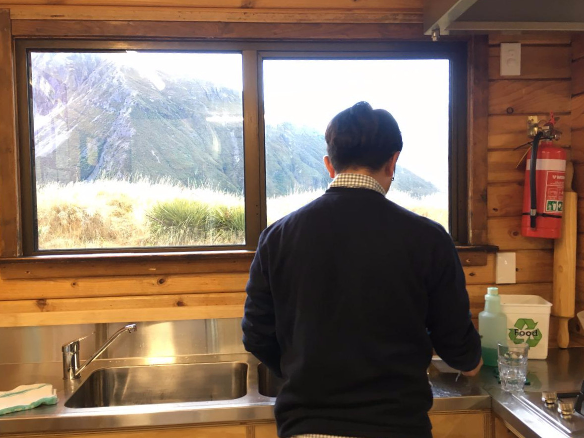 이날은 후커벨리(Hooker Valley) 트래킹을 앞두고 있어 아침부터 든든히 챙겨 먹었습니다. 가져간 한국 라면으로 끼니를 때우고 해장하고 난 후, 만년설을 앞에 두고 설거지하는 우리 넘편. 집 앞에도 만년설을 가져다 두면 설거지를 바로바로 하게 될까요.