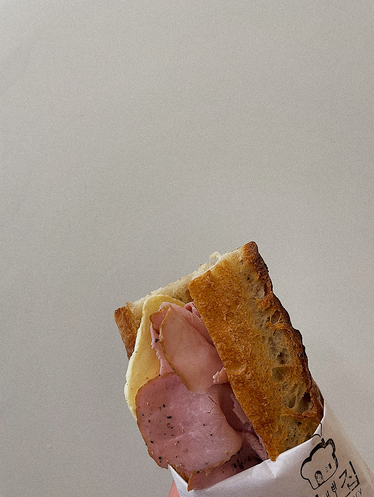 프랑스의 잠봉은 간이 세지만 나의 잠봉뵈르는 짠맛이 거의 없다. 무염버터를 넣고 짜지 않은 잠봉을 구한 건 나의 바게트를 돋보이게 하기 위한 선택이었다. 한입 베어 물면 잠봉이 씹히고, 이게 뭐지 싶을 정도로 다소 밋밋한 버터가 훅 혀를 감싼다. 이내 고소해진 버터의 풍미를 즐기다 보면 바삭한 바게트가 미끄덩한 입안을 개운하게 쓸어준다.