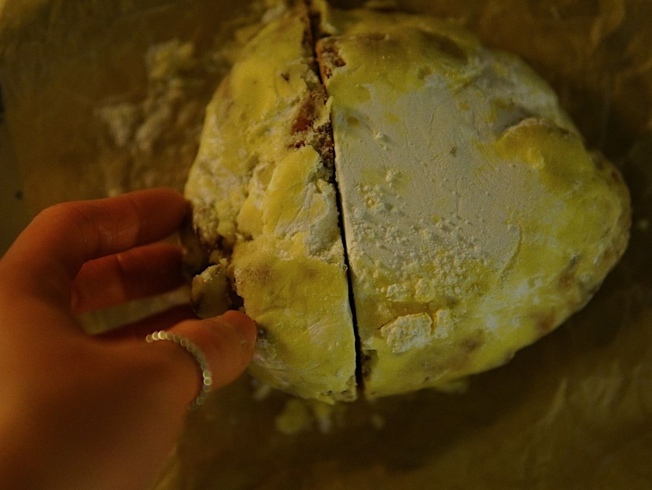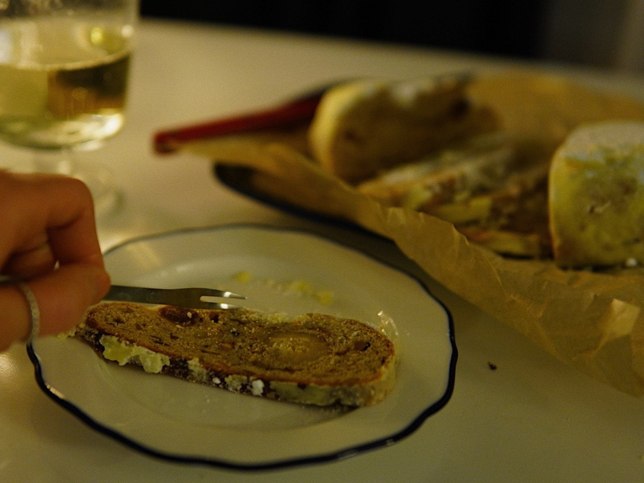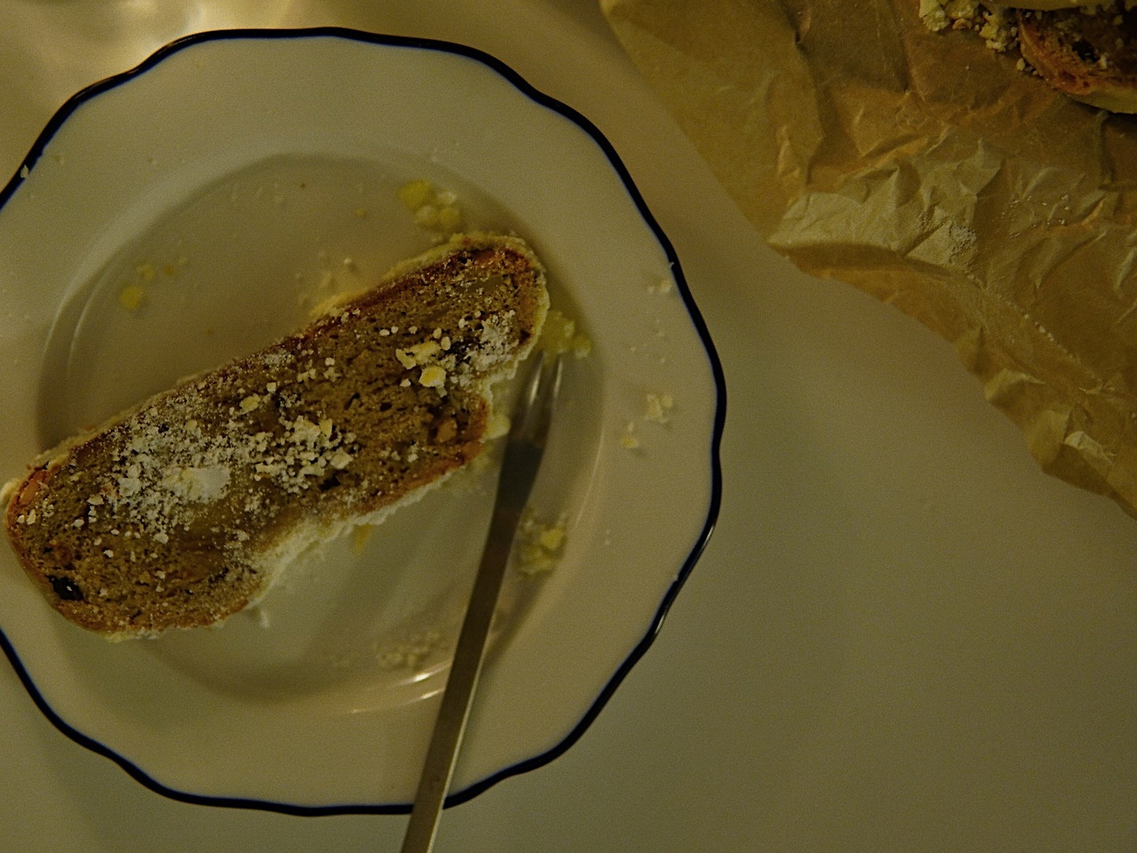 남편과 나를 위한 슈톨렌 한 덩이는 따로 남겨두었다. 크리스마스를 며칠 앞두고 드디어 마지막 한 조각을 썰었다. 알코올 향이 달아난 건과일과 향신료가 뒤섞인 오묘한 향이 혀를 감돈다. 쿠키와 파운드케이크 사이를 오가는 식감이 재밌다. 달큰한 건과일 사이로 오독오독 씹히는 견과가 묵직하다. 지난 일 년의 찐한 풍미가 느껴진다.