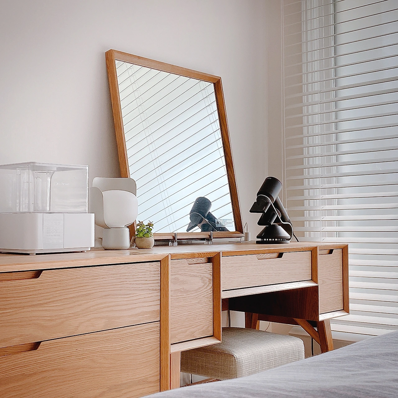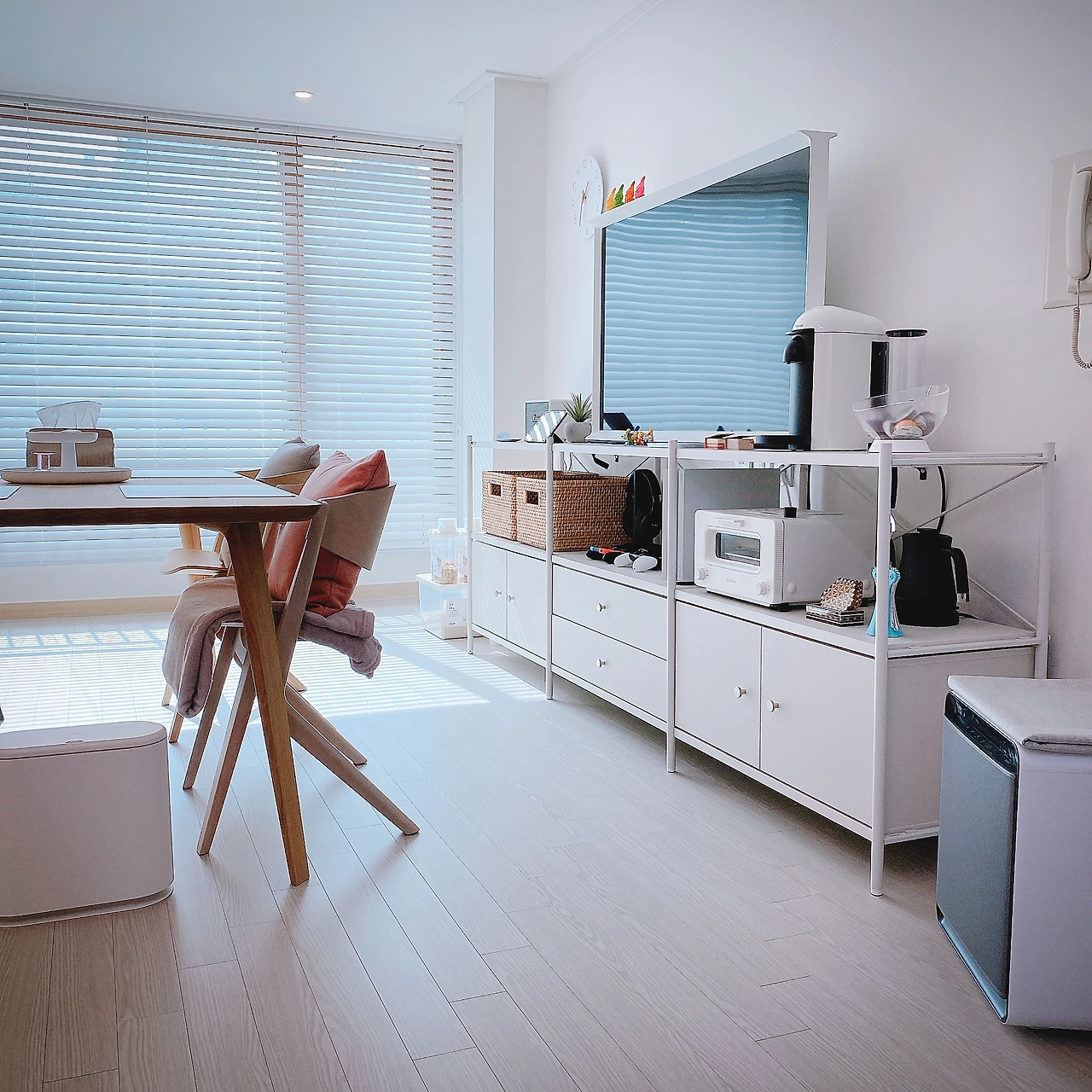 - 숨김 수납이 가장 깔끔하겠지만 모든 물건을 서랍에 넣어둘 수는 없습니다. 선반 위에 올려두어야만 하는 물건들이 있죠. 믹서기, 에어프라이기 같은 소형 주방가전이나 물티슈, 갑 티슈 같이 수시로 쓰는 생활용품이 그렇습니다. 스메그, 발뮤다, 다이슨 같은 브랜드는 디자인이 훌륭해서 그 자체가 공간을 꾸며주는 소품이자 오브제가 됩니다. 무리하는 게 아니라면 조금 돈을 더 들여서라도 처음부터 깔끔한 것을 사고, 물티슈나 갑 티슈는 케이스를 사서 담아두면 늘 나와있더라도 보기에 좋습니다.