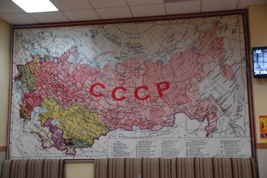 블라디보스톡 시내의 쓰톨라바야 넘버원이라는 가게에 걸린 대형 지도. 색깔로 표시된 부분이 옛 소련의 영토.