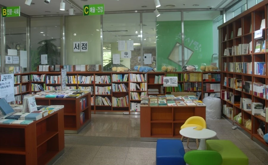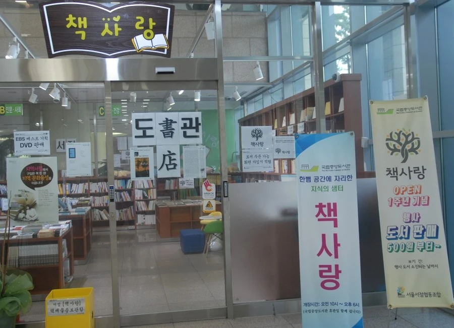 정말 그랬다. 국립중앙도서관에는 도서관 안에 서점이 버젓이 자리를 잡고 있다. 그것도 1층 현관을 들어가자마자 떡 하니 오른쪽 바로 앞, 아주 잘 보이는 곳에. 새로 만든 간이 열람실인가 싶어 가까이 갔더니 ‘도서관’과 ‘서점’이라는 단어가 모두 쓰여 있다. 궁금해서 문을 열었다.