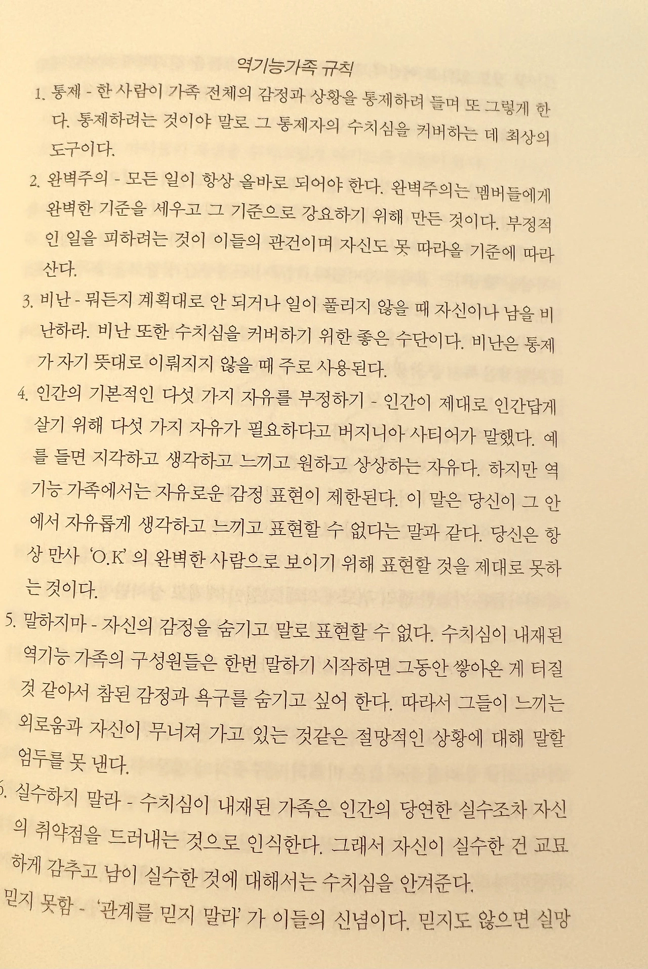 6. 실수하지 말라 - 수치심이 내재된 가족은 인간의 당연한 실수조차 자신의 취약점을 드러내는 것으로 인식한다. 그래서 자신의 실수한 건 교묘하게 감추고 남이 실수한 것에 대해서는 수치심을 안겨준다.