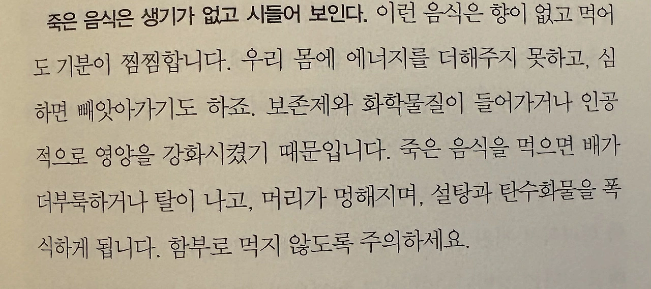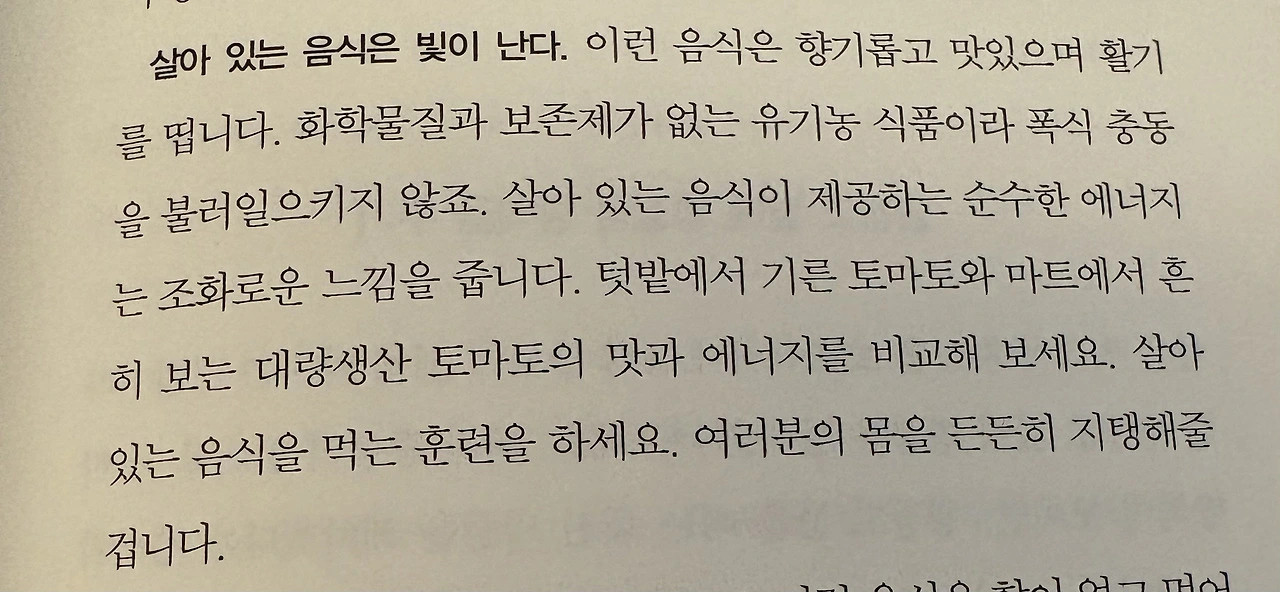 음식은 단순히 입으로 삼키는 것이 아니라, 누군가의 생명과 연결된 것임을 깨달았다. 그래서 나는 내 몸이 주는 지혜에 귀 기울이며, 살아 있는 음식을 선택하려 한다.