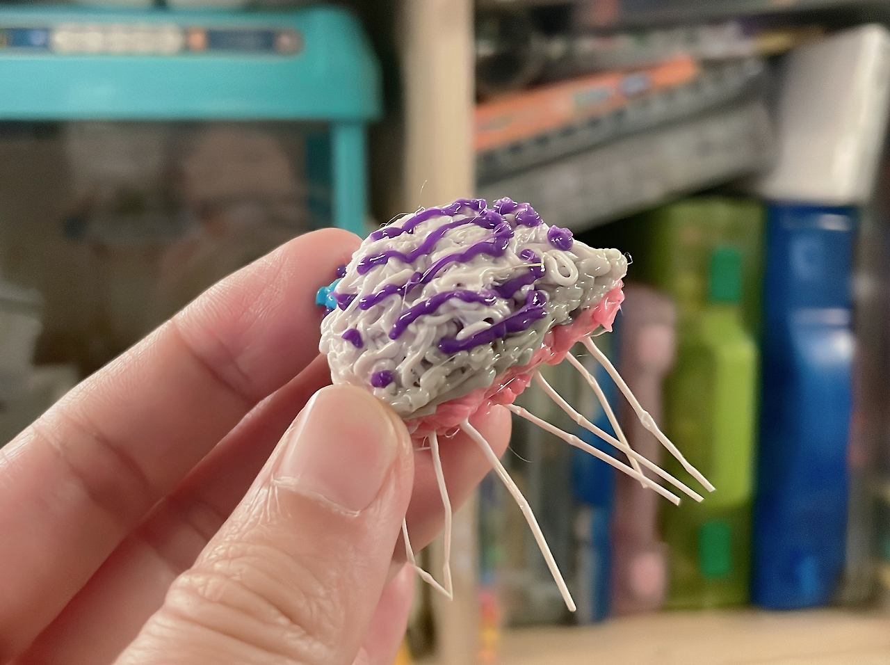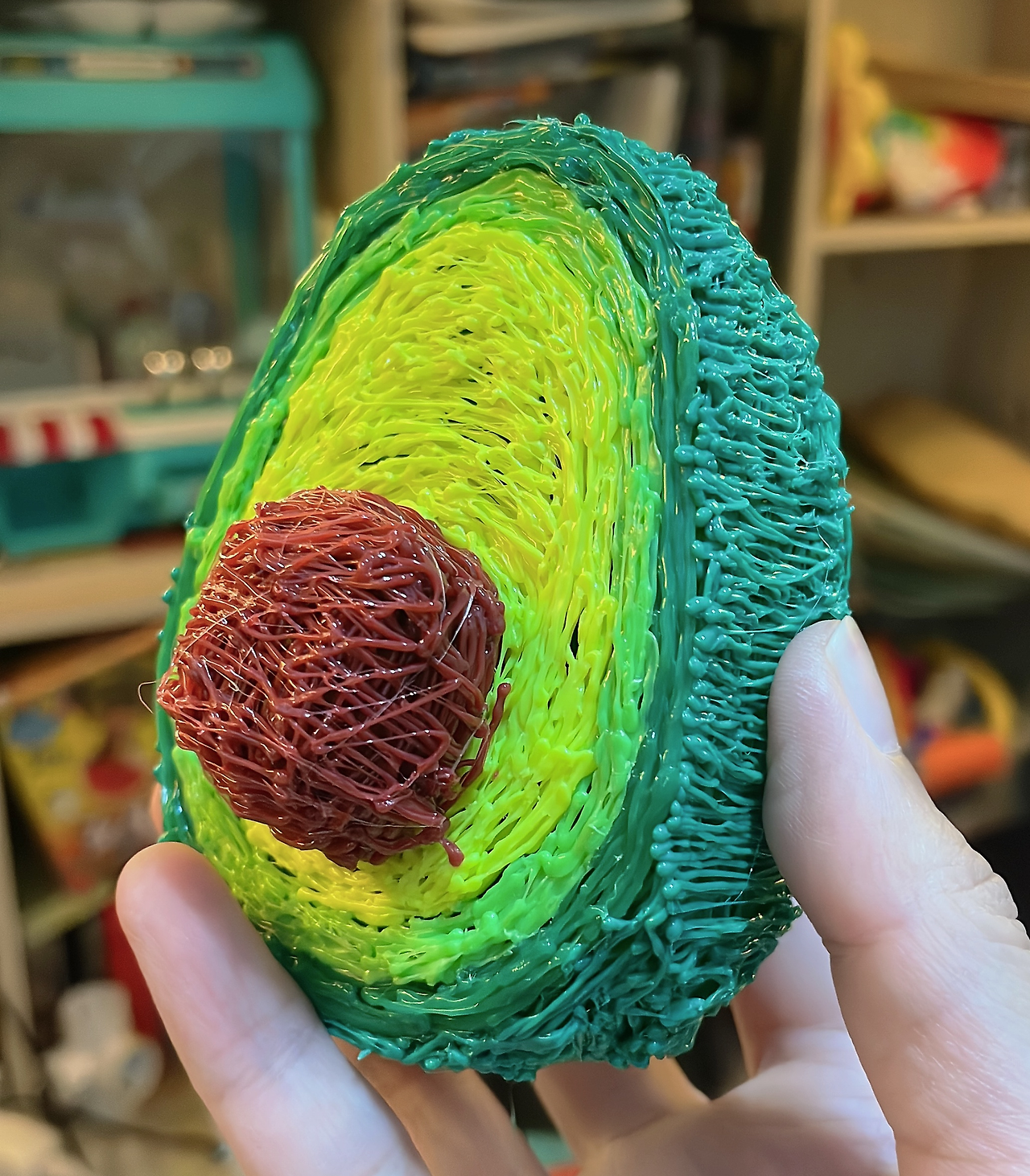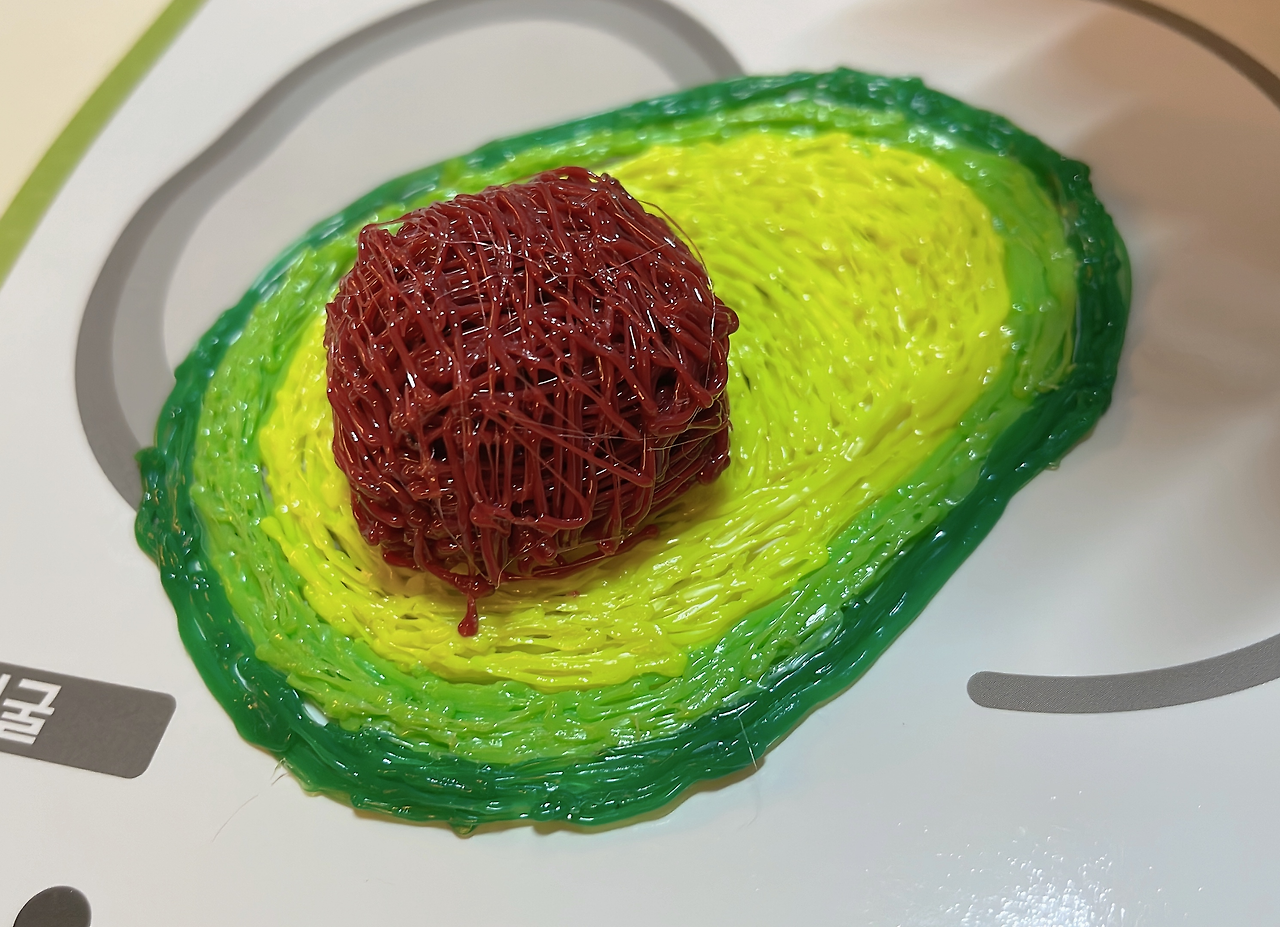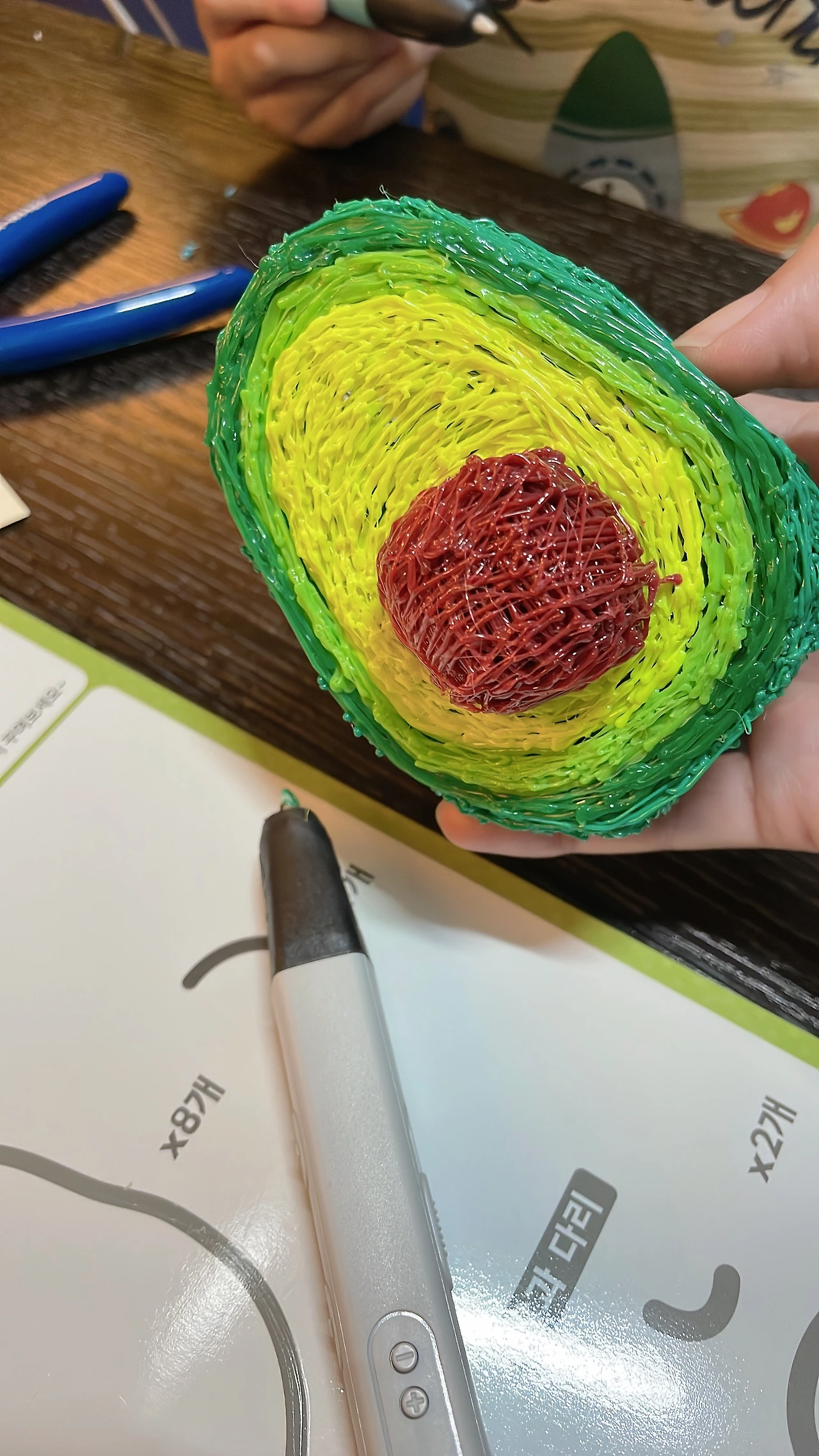 아주 곧 잘 만들었습니다. 나름 앞뒤 디자인도 다르게 하고, 해파리 다리도 세심하게~ ㅎㅎㅎ 밑에도 핑크색으로 컬러감을! 해파리 다리가 구부려진다고 이리저리 모양을 만들어 보더니 아주 만족해합니다. 그 사이에 저도 아보카도를 한번 만들어봤습니다. 처음에 샀을 땐 이게 정말 맞나 싶을 정도로 이상한 모양들이 만들어졌었는데, 어느새 저도 약간 적응이 됐는지 전보다 확실히 수월해졌습니다.
